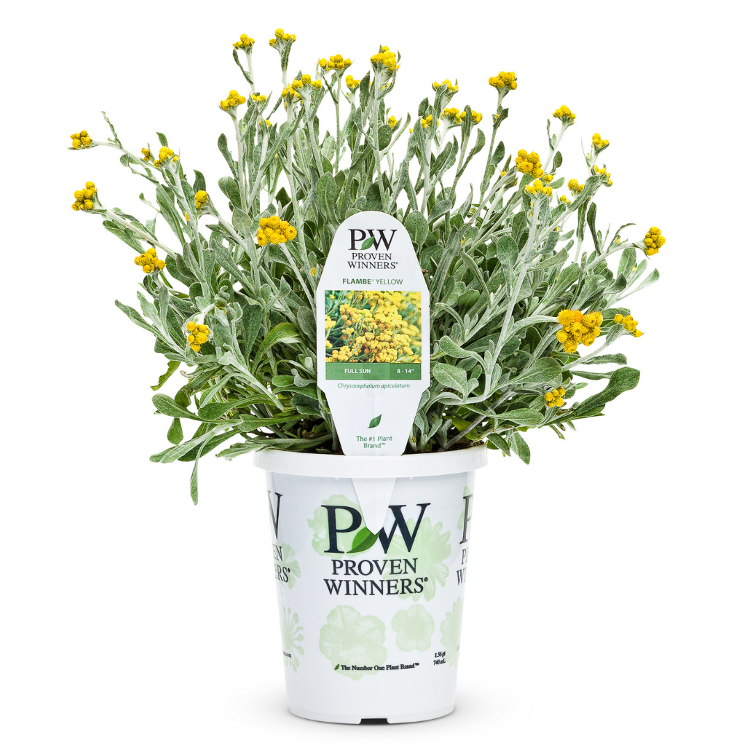 Flambe Yellow Strawflower has masses of beautiful clusters of yellow button flowers at the ends of the stems from late spring to mid fall, which are most effective when planted in groupings. Its tomentose narrow leaves remain silver in color throughout the season.