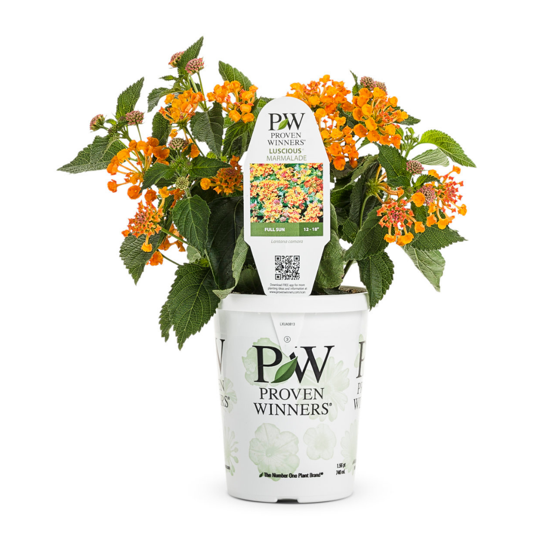 Luscious® Marmalade Lantana features showy cymes of coral-pink flowers with orange overtones and yellow centers at the ends of the branches from early summer to mid fall. Its tomentose pointy leaves remain green in color throughout the year.