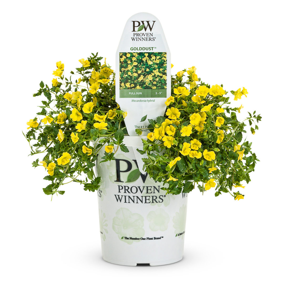 Gold Dust Mecardonia has masses of beautiful yellow round flowers held atop the stems from early summer to mid fall, which are most effective when planted in groupings. Its small round leaves remain green in color throughout the season.
