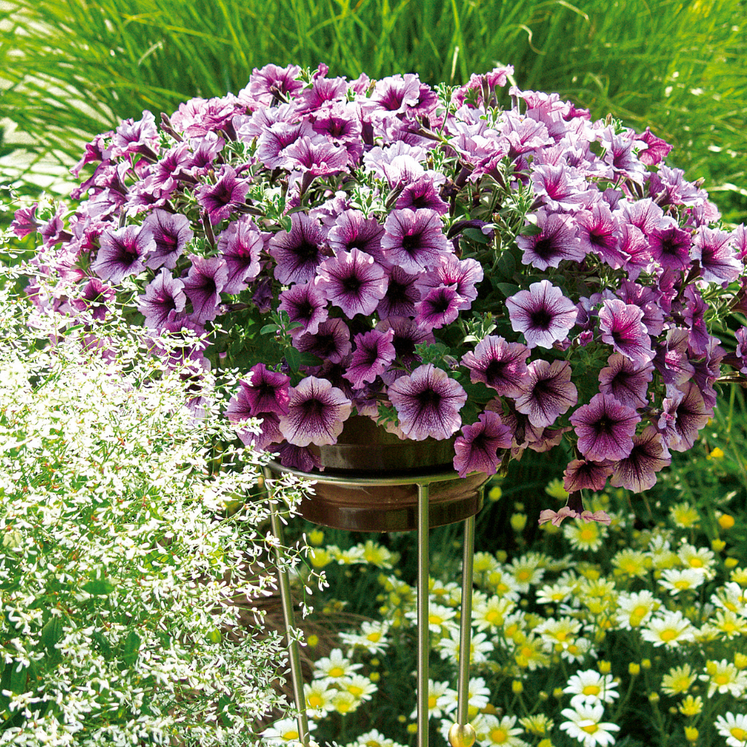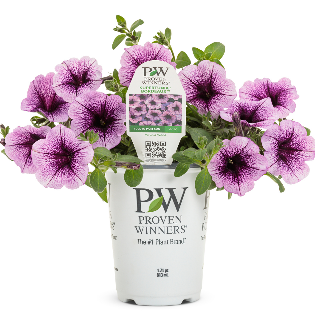 Supertunia® Bordeaux Petunia is covered in stunning pink trumpet-shaped flowers with purple veins at the ends of the stems from mid spring to mid fall. Its pointy leaves remain green in color throughout the season.