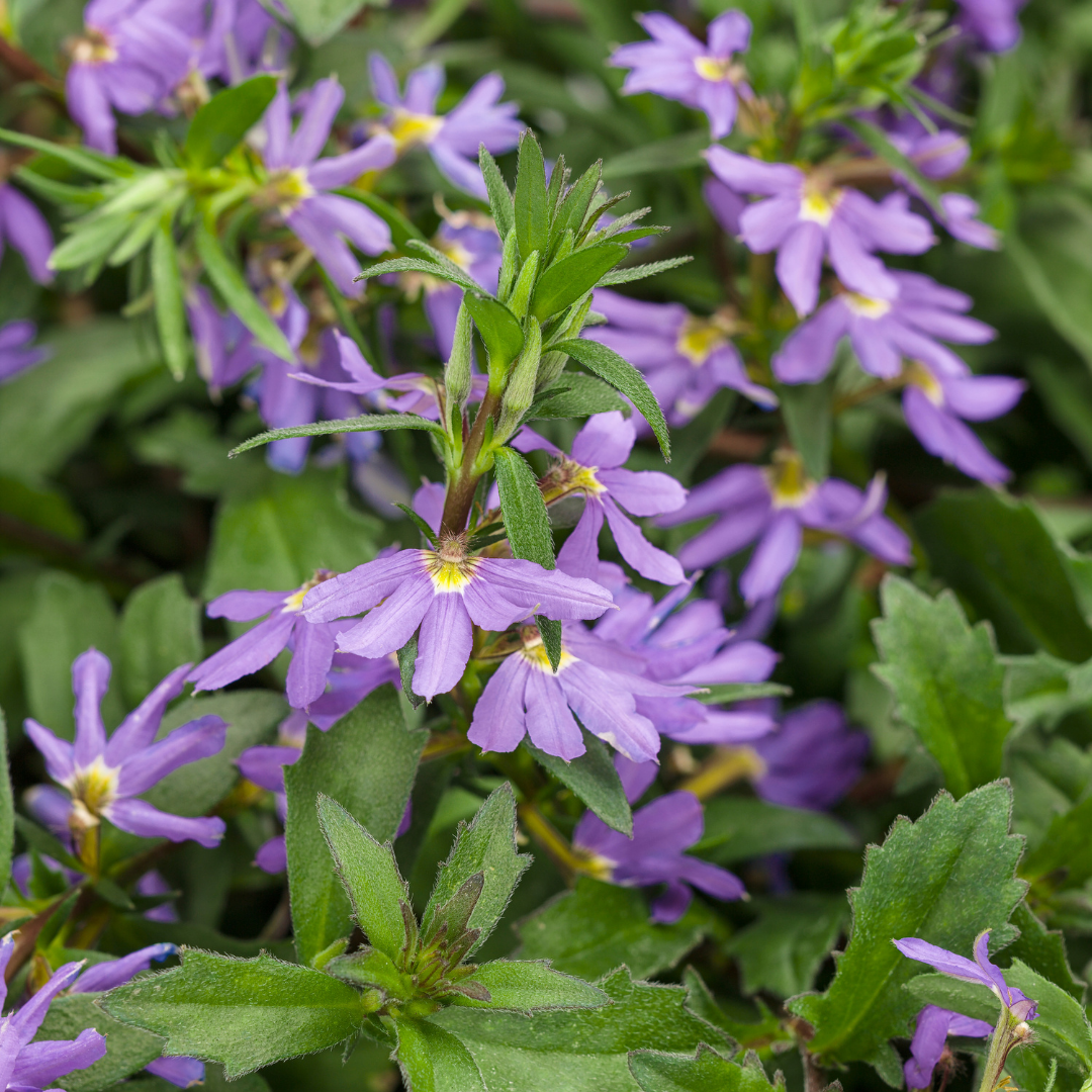 Whirlwind® Blue Fan Flower features dainty royal blue flowers along the stems from mid spring to late summer. Its small serrated oval leaves remain dark green in color throughout the season.