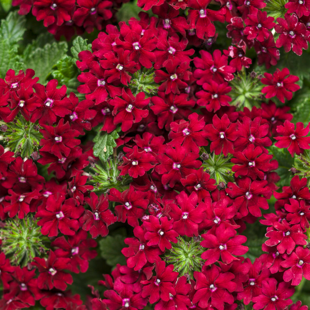 Superbena® Royale Romance Verbena features showy clusters of crimson star-shaped flowers with white eyes at the ends of the stems from late spring to mid fall. The flowers are excellent for cutting. Its tiny tomentose narrow leaves.
