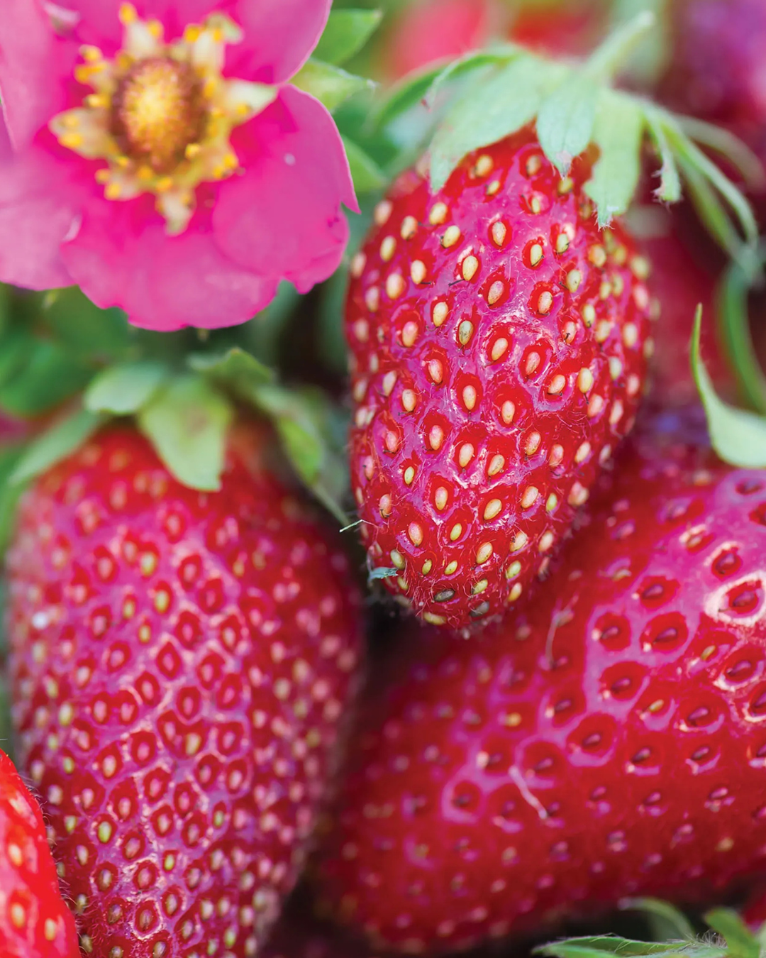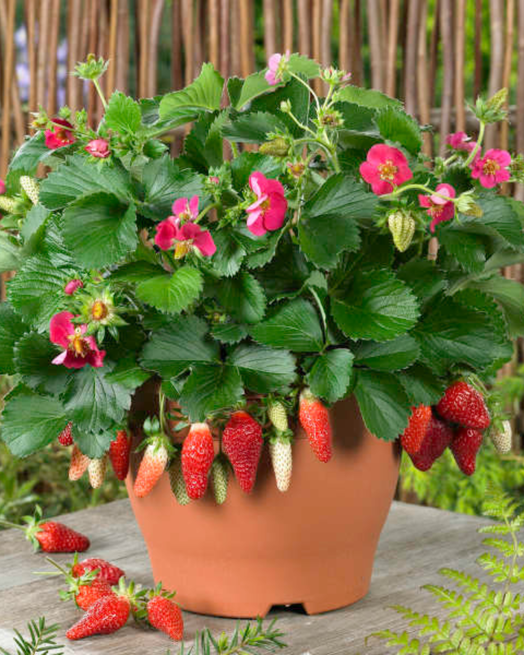 This everbearing variety combines both showy magenta-pink flowers and delicious fruit all season long; vigorous, winter hardy, and shows good disease resistance; great for containers