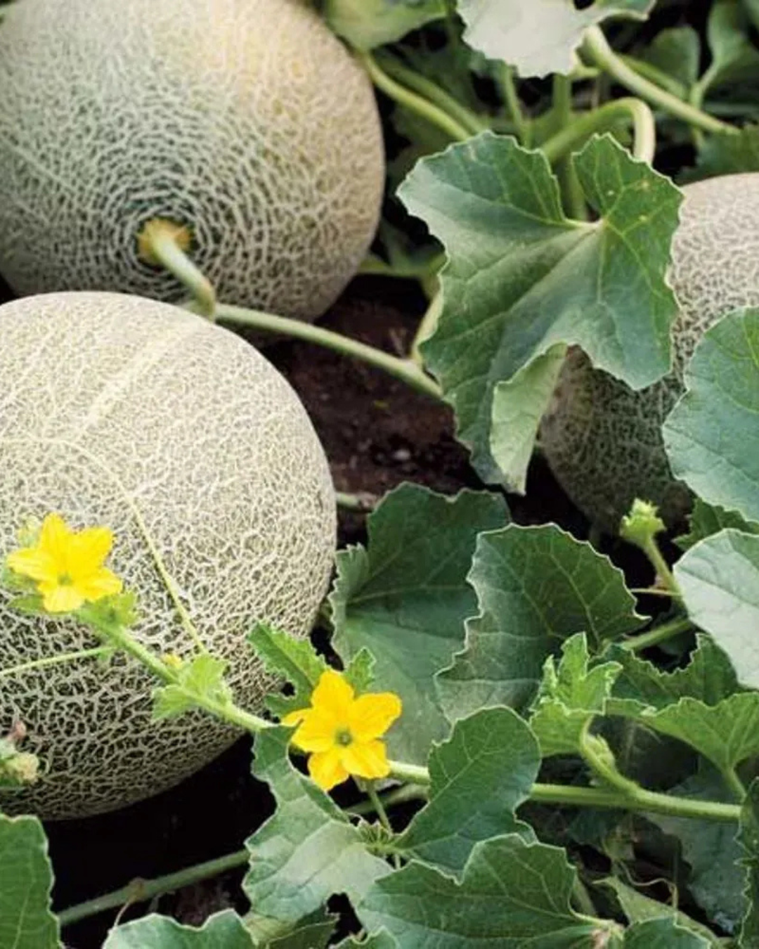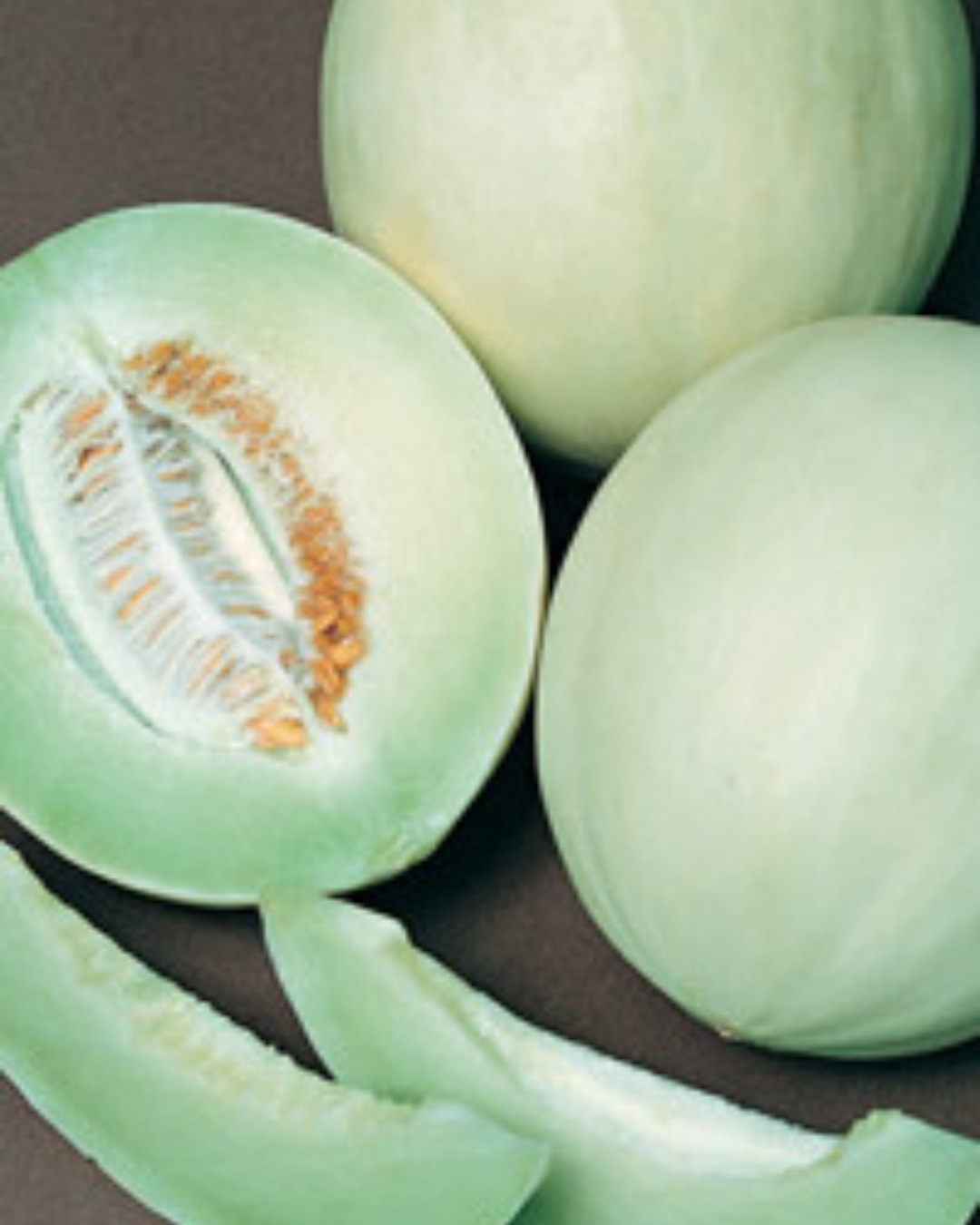 Description: The light green insides of this melon are delicious and sweet. Strong vines produce excellent, early yields with slightly oval, smooth fruits that are 6-8 pounds. Plant in mounds in groups of 3 plants, allowing 1 foot between each plant. Allow 4-6 feet between each mound. Perfect for use in fruit salads or eaten on its own.