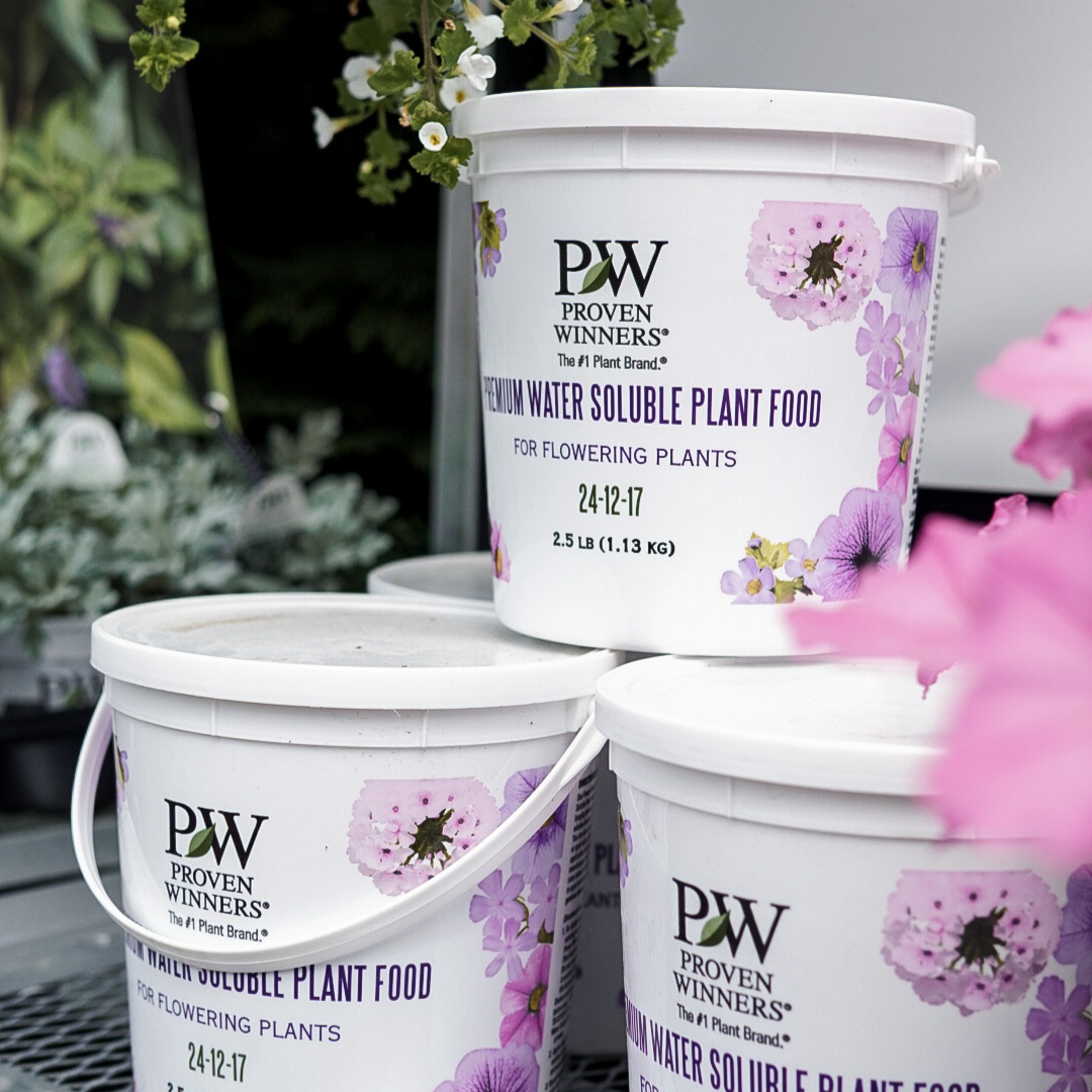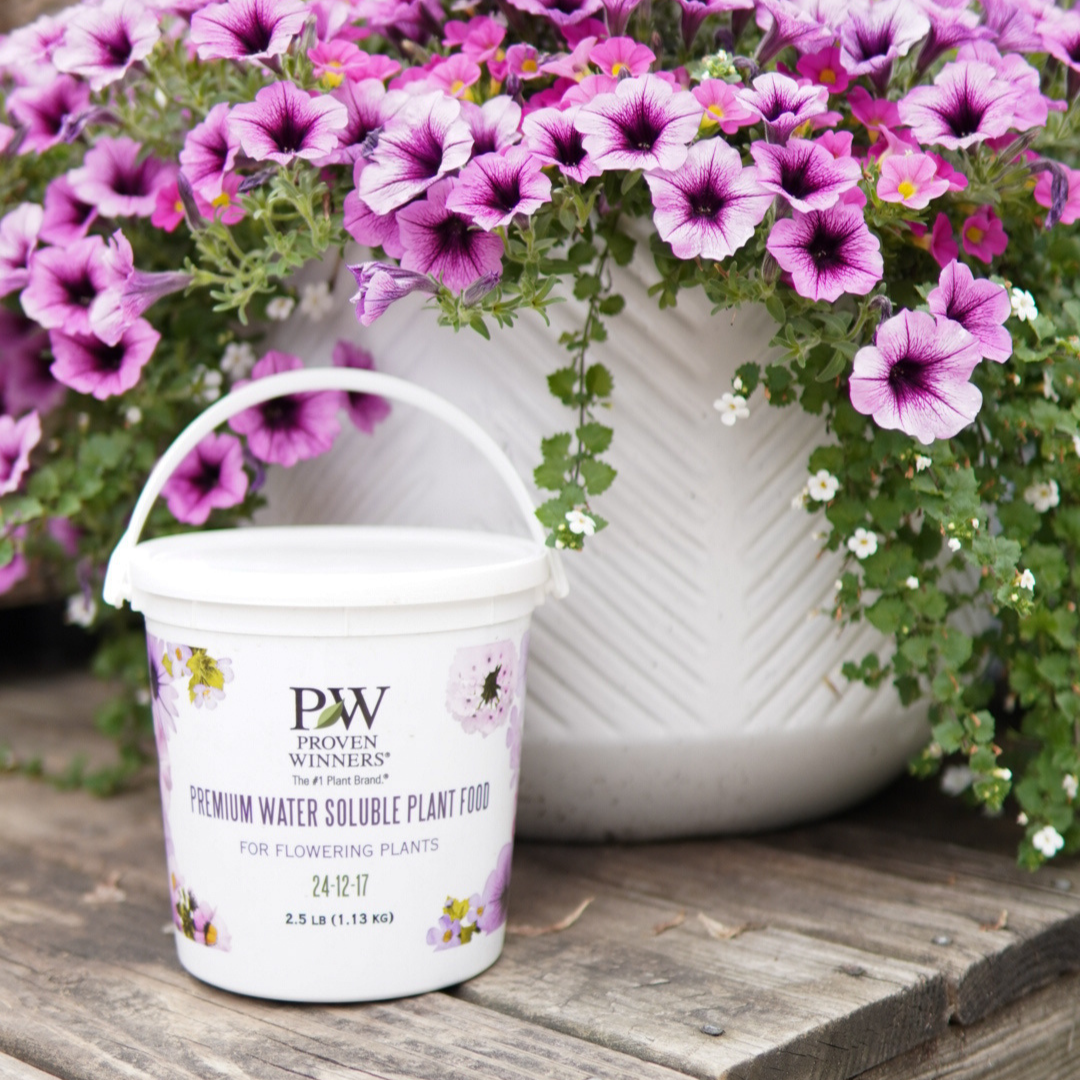 Are your plants looking tired or hungry? Are your Petunias yellow or only flowering at the ends of the plant? If you answered yes to any of these questions, you need Proven Winners® Premium Water Soluble Plant Food. The unique 24-12-17 + minors NPK formulation also includes the EDDHA form of Iron, which allows plants to use iron efficiently at wide pH ranges. This form of Iron allows plants like Supertunia® Petunias and Superbells® Calibrachoa to stay green, full, and healthy throughout the growing season.