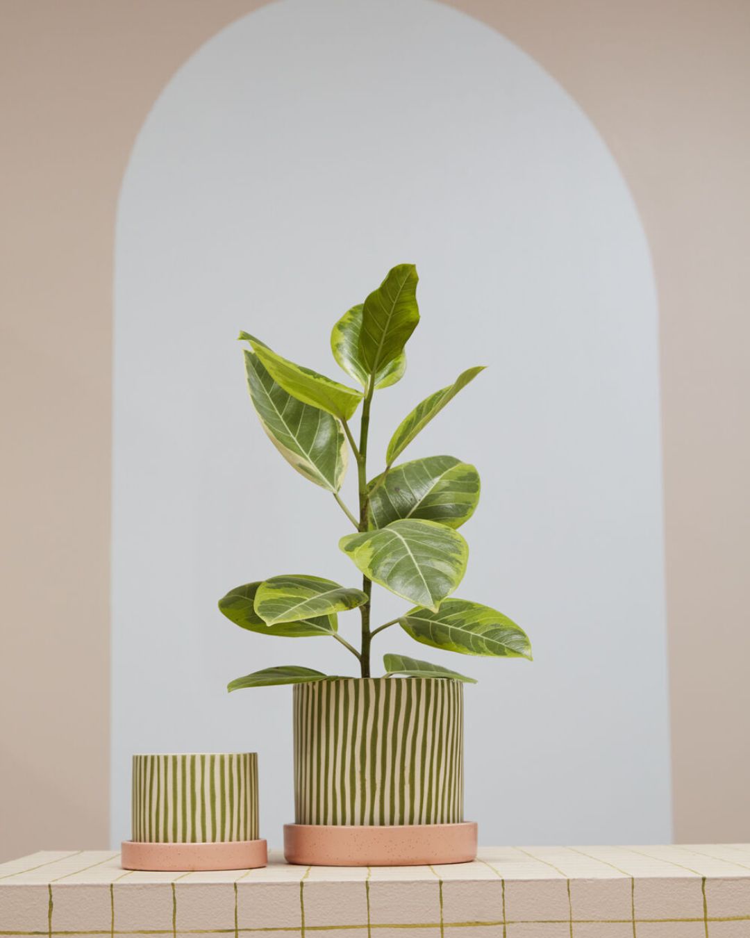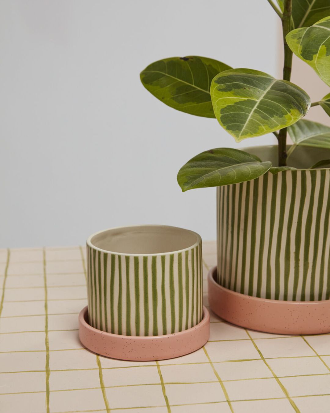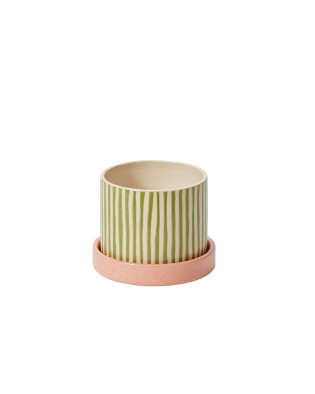 Reminiscent of a watermelon with its playful striped pattern & energizing hues, the small Melancia Pot lifts up the room with color. This pot with a drainage hole features hand painted glossy green vertical stripes on a natural clay base that contrasts nicely with the smooth matte coral pink saucer with a speckled finish. This fun indoor plant pot makes a happy addition to a modern plant shop & home decor.
