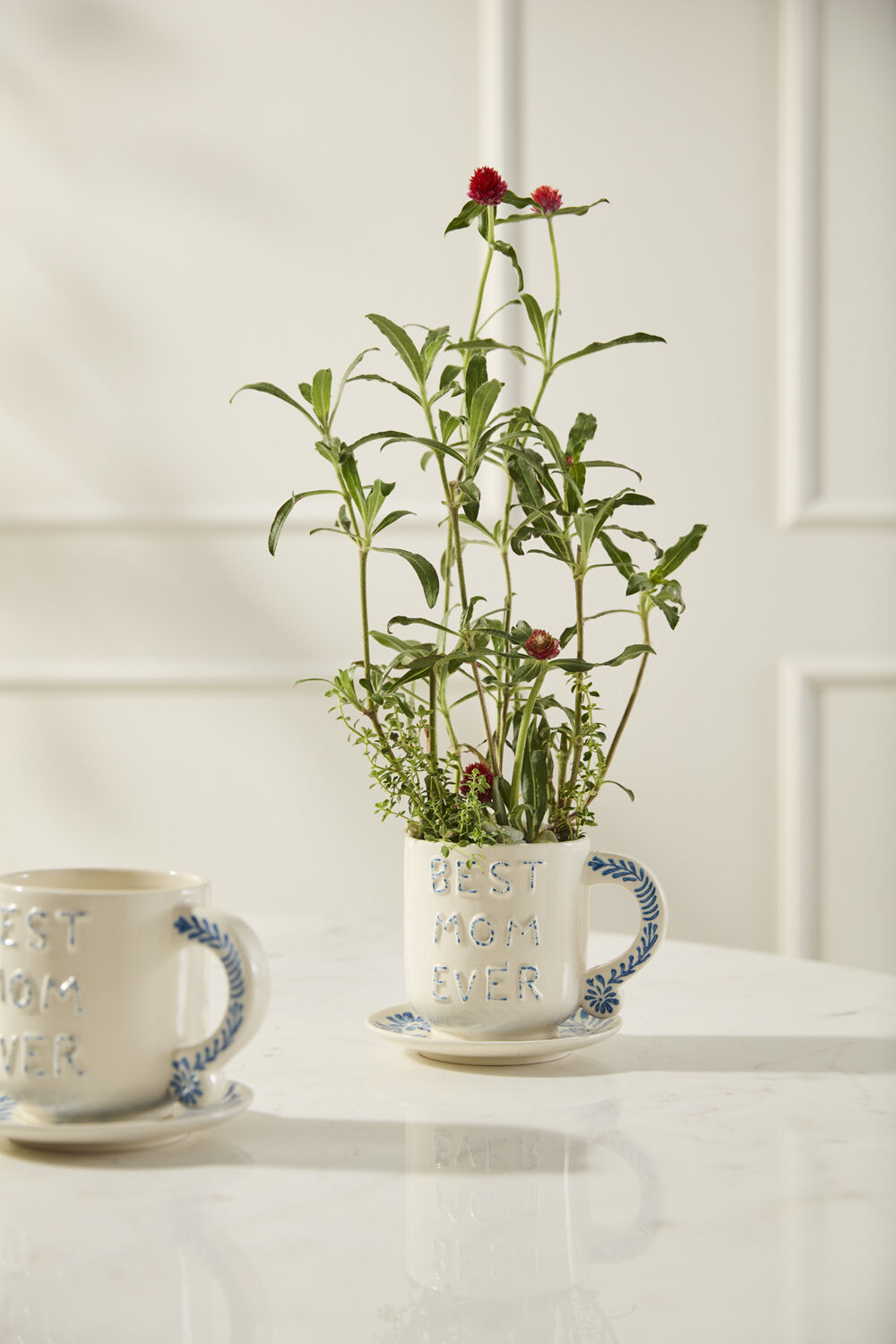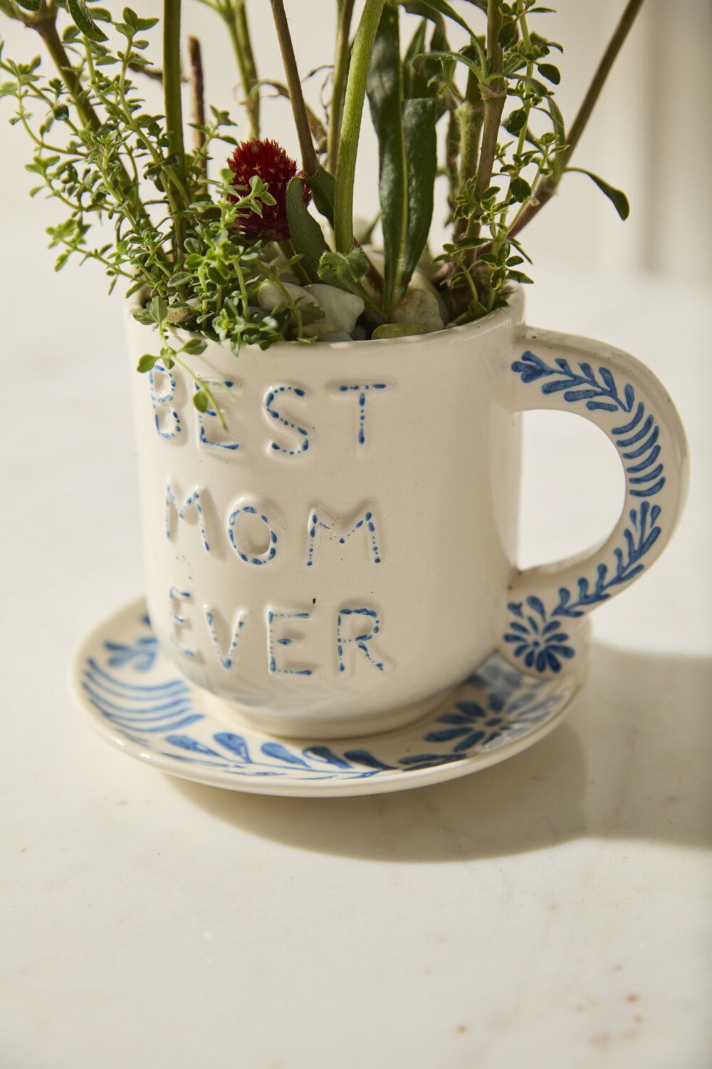 Give Mom an affirmation she can see every day with the Best in Blue Mug. This mug & saucer features hand cut & applied lettering on the front that says "Best Mom Ever" with blue & white detailing on a white ground color. The mug handle & saucer are hand painted with a matching blue leaf pattern. Perfect for morning coffee or even a 3-inch drop-in plant, this mug makes a lovely Mother's Day or birthday gift.