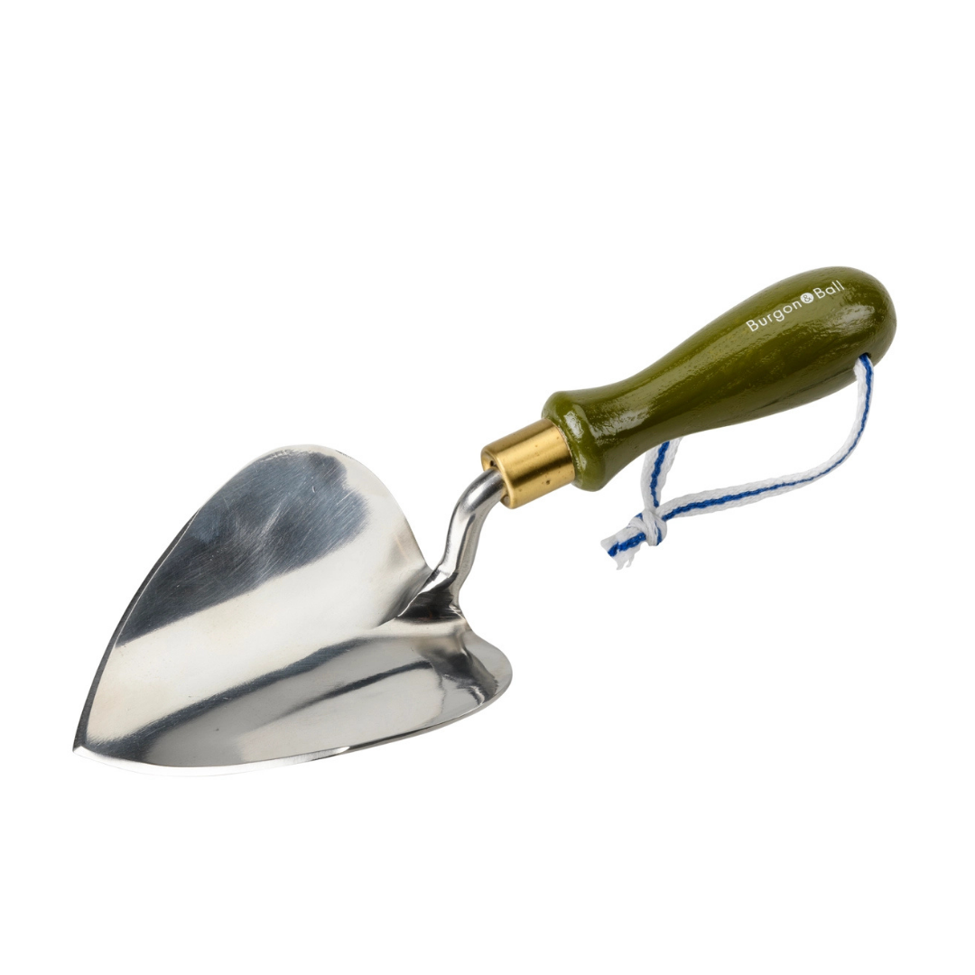 This planting trowel has a painted wooden handle in a beautiful olive green. The ferrule which connects head and handle is solid brass, bringing a beautiful warm highlight to the look. There’s a striped cotton hanging cord for easy storage. The polished stainless steel finish is highly resistant to rust, so it'll stay beautiful for years to come.