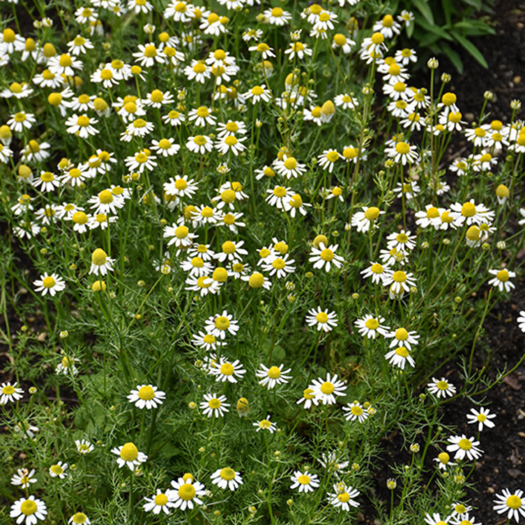 Description: This aromatic herb has finely cut spreading foliage and lovely white flowers in July. Leaves and flowers used in beneficial teas and hair conditioners. Plant in the border garden in average, well-drained soil.