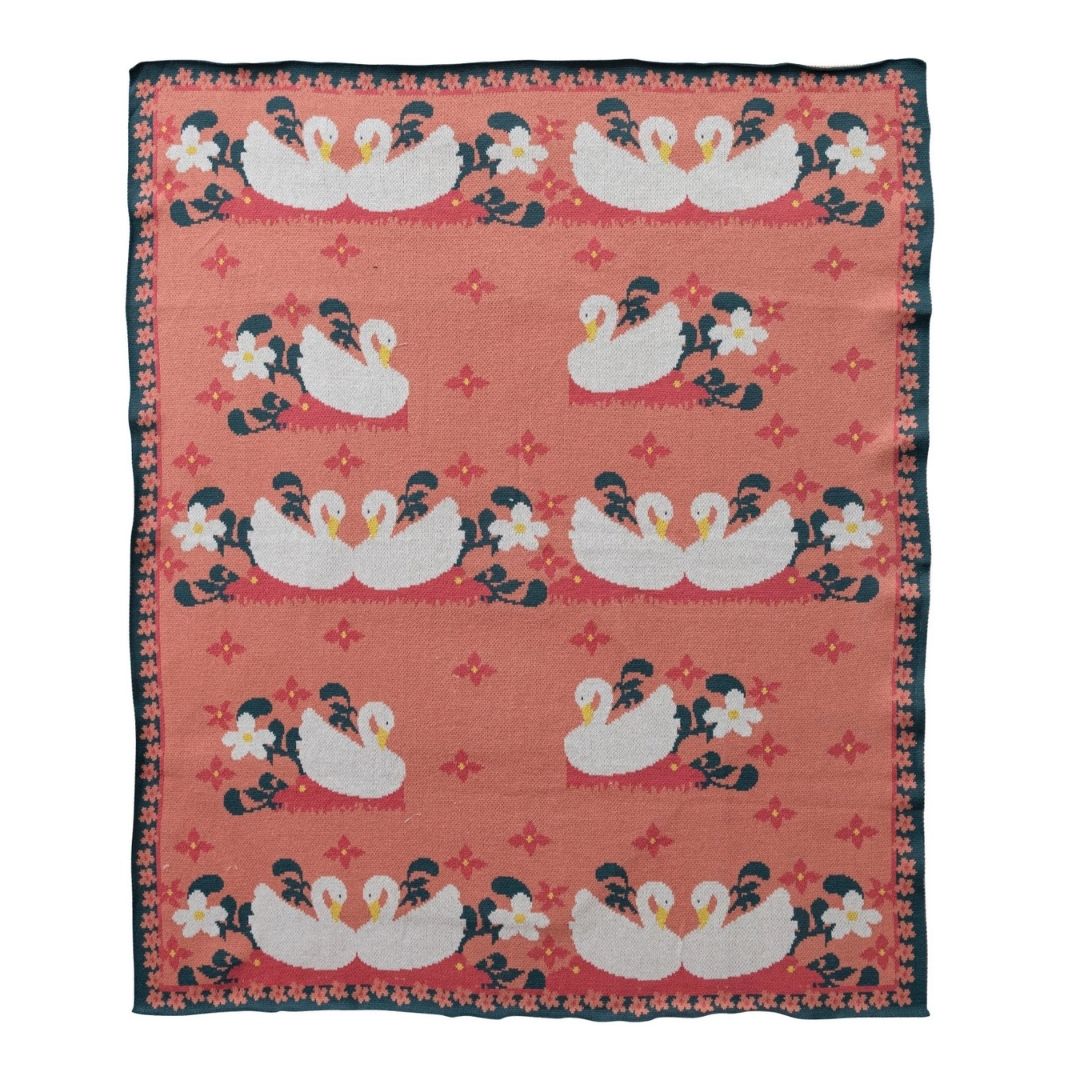 Cotton Knit Baby Blanket with Swans & Flowers