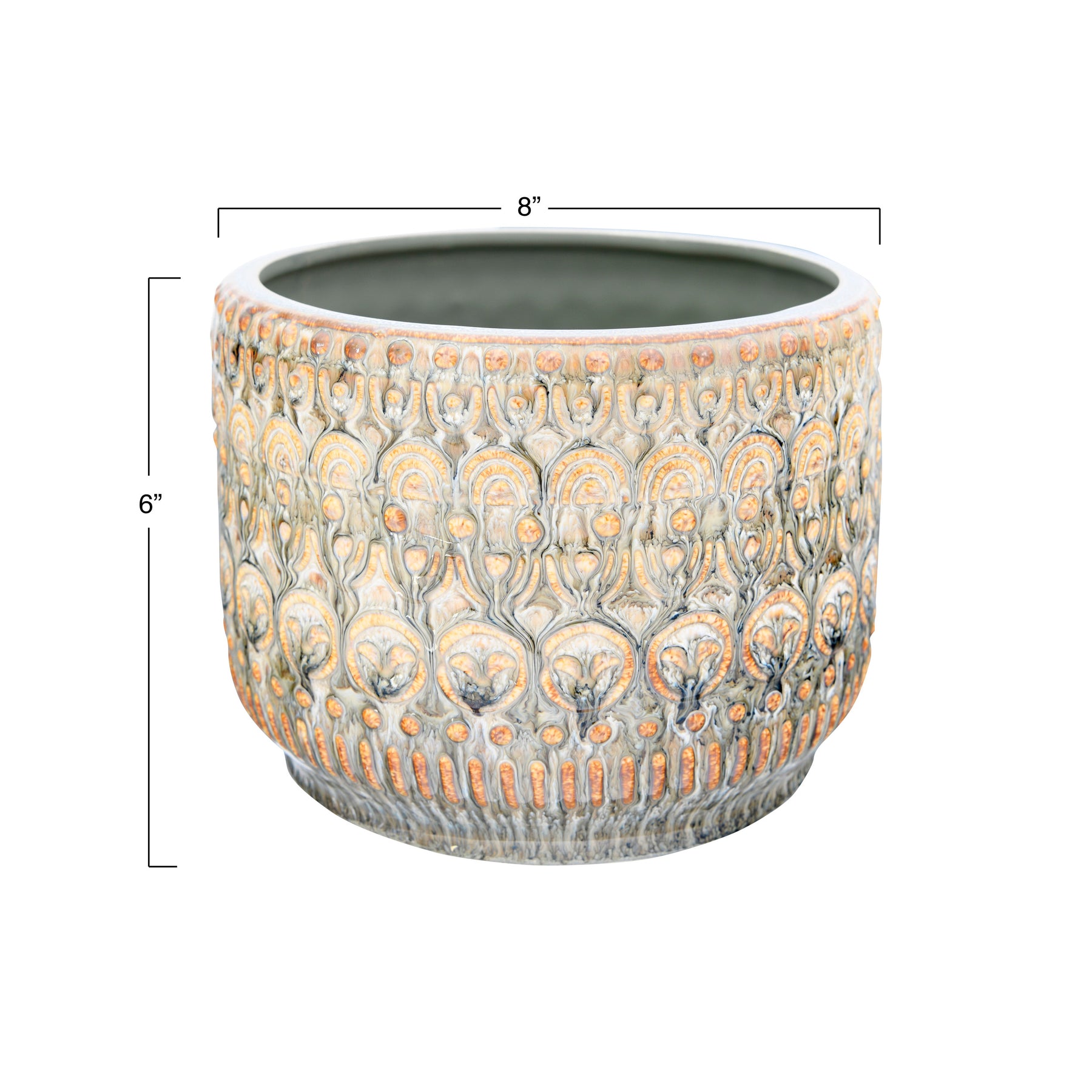 With detailed embossing and a distressed finish, this stoneware planter features a remarkable reactive glaze finish. The glazing process creates individual works of art on each distinctive piece. Fill it with a potted plant and display on a tabletop or mantel for an amazing accent to the room decor.