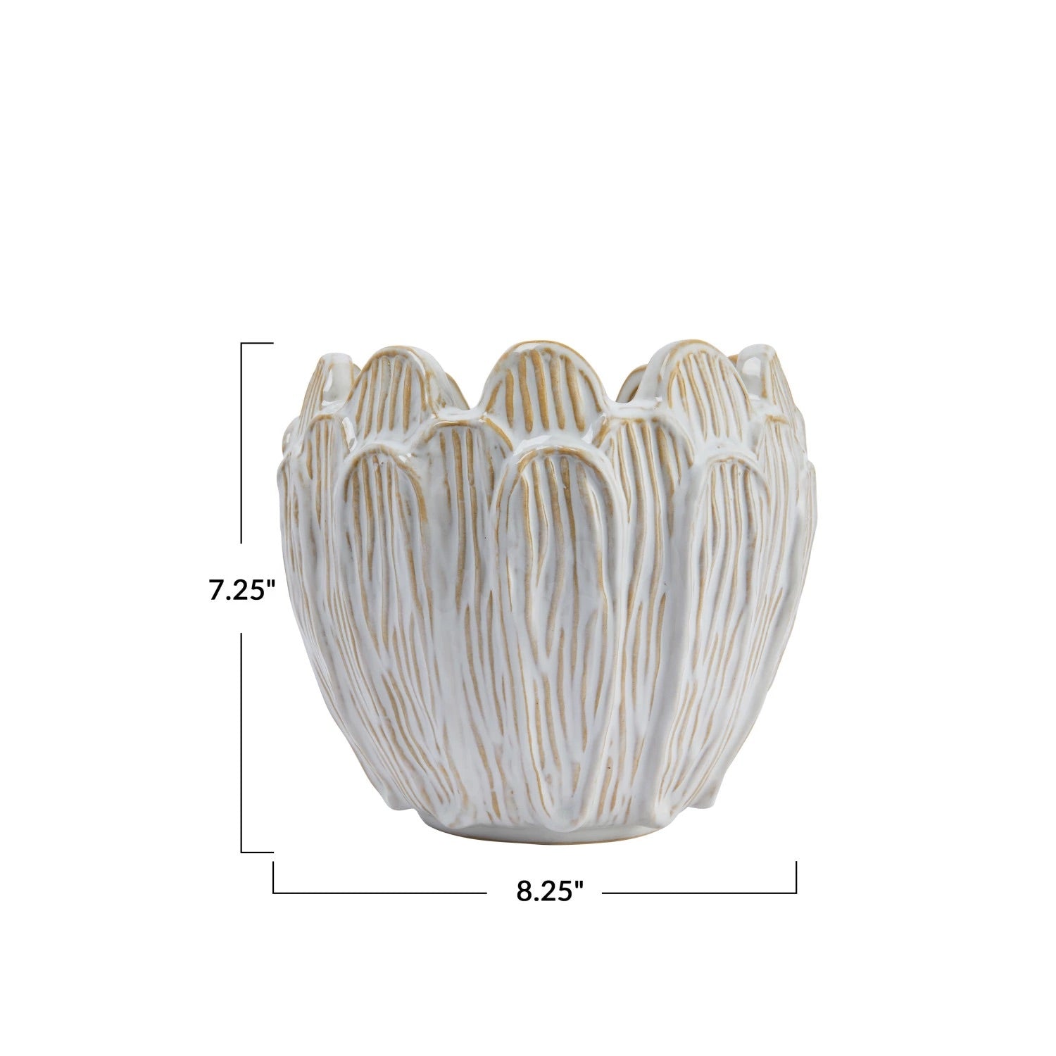 This Debossed Stoneware Flower Shaped Planter with Reactive Glaze in Cream Color creates a cozy and inviting space. This planter is made of high-quality, durable stoneware material with a flower-shaped silhouette and debossed pattern that gives it a rustic and elegant look. The planter has a reactive glaze finish that creates a natural variation of cream color, making each piece unique and beautiful. The planter has no drainage holes, so it is suitable for plants that do not require much water, such as succulents, cacti, or air plants. The planter measures 8.25 inches in diameter and 7.25 inches in height and can hold a large pot. This planter adds French country charm to the space with its lovely design, whether placed on the floor, table, windowsill, or shelf. A lovely stoneware planter that features a flower-shaped silhouette and a debossed pattern. Ideal for adding some French country charm to the indoor or outdoor plants.