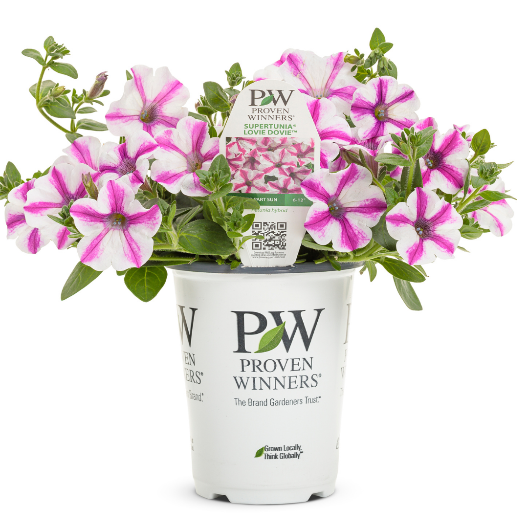 Supertunia® Lovie Dovie™ Petunia is smothered in stunning white trumpet-shaped flowers with hot pink stripes at the ends of the stems from mid spring to mid fall. Its pointy leaves remain green in color throughout the season.
