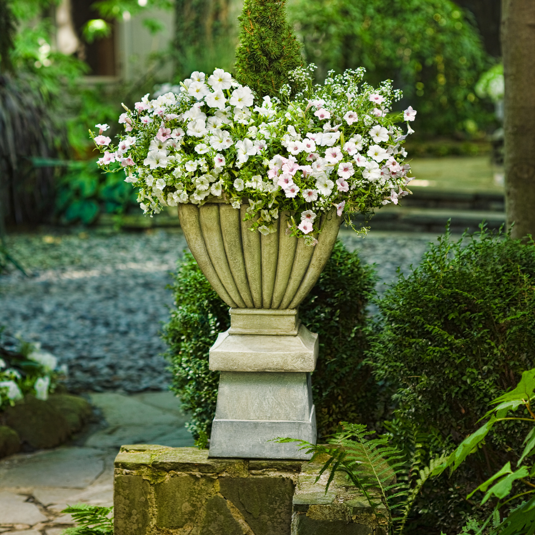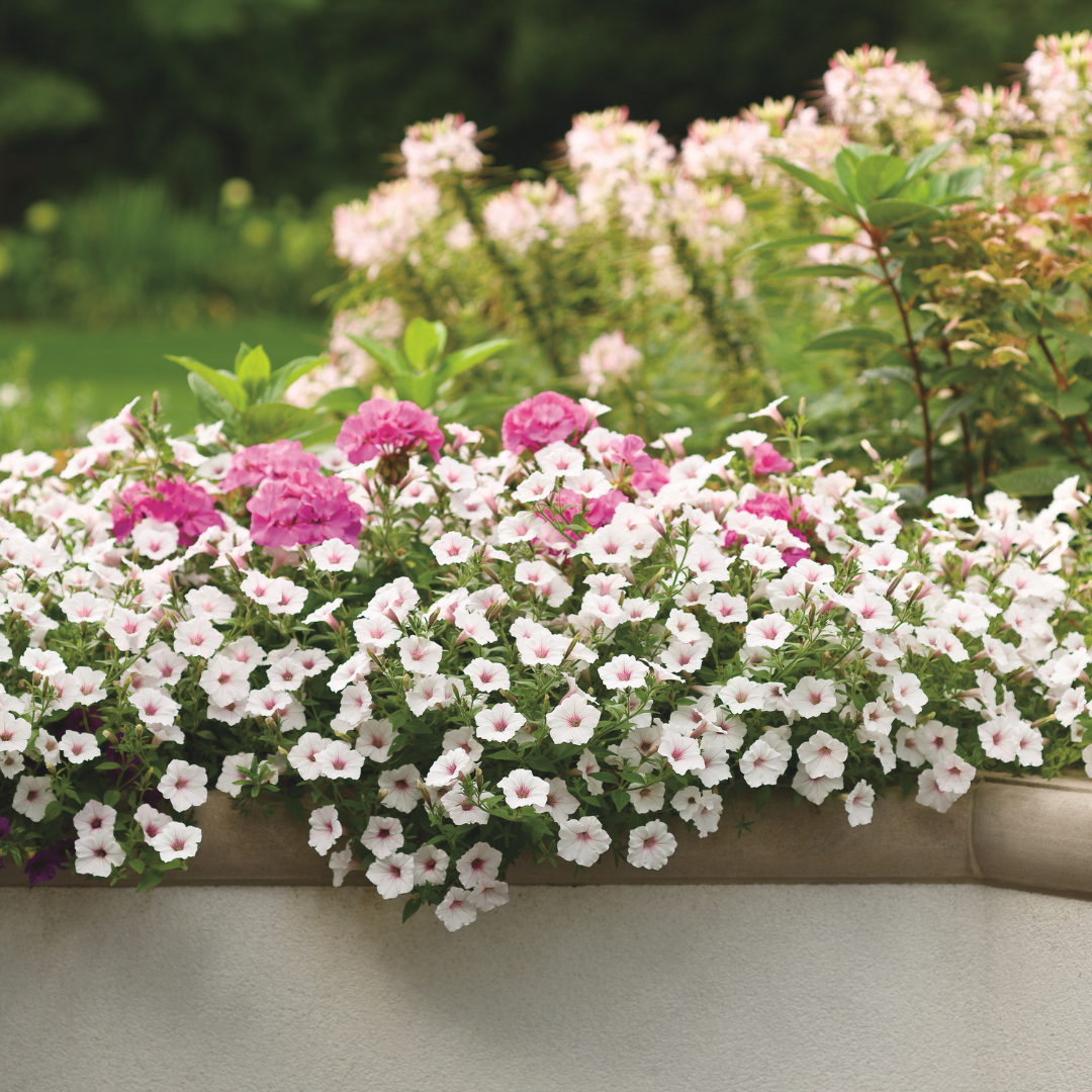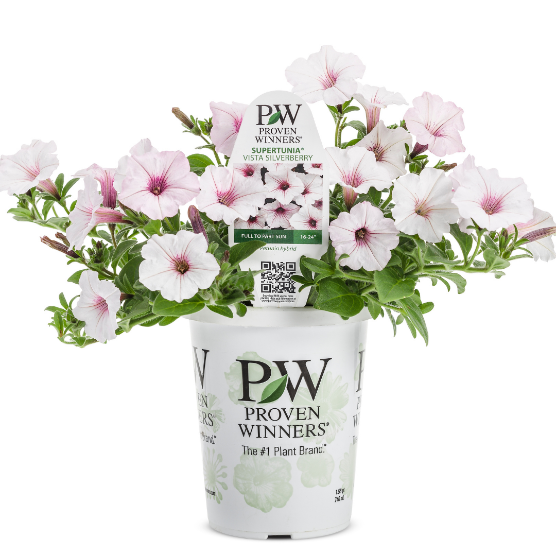 Supertunia Vista® Silverberry Petunia is smothered in stunning white trumpet-shaped flowers with pink veins at the ends of the stems from mid spring to mid fall. Its pointy leaves remain green in color throughout the season.