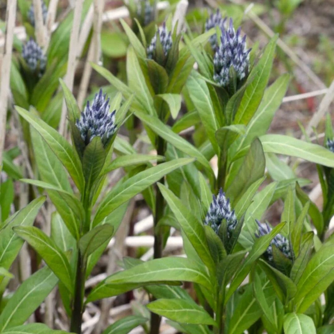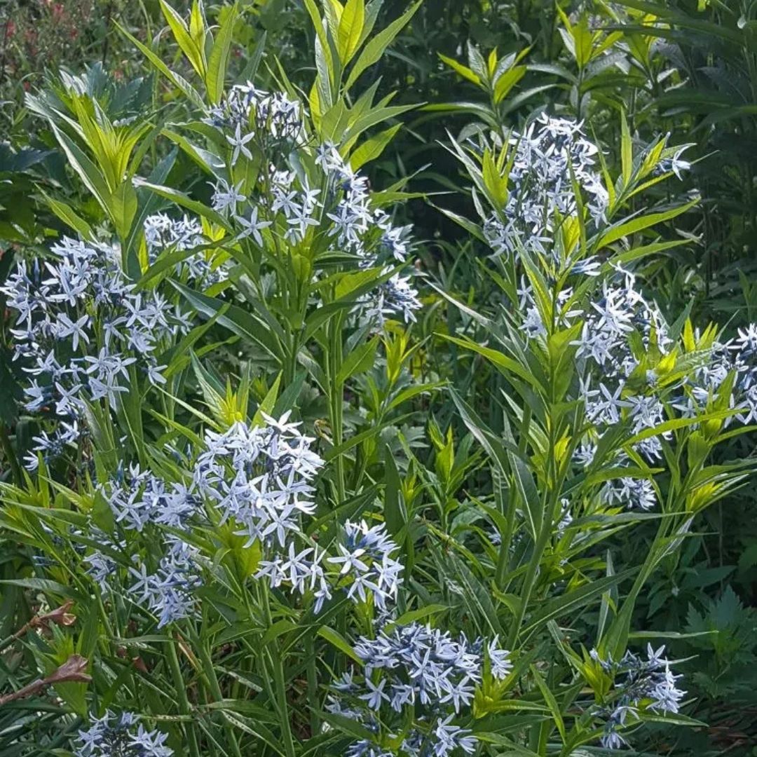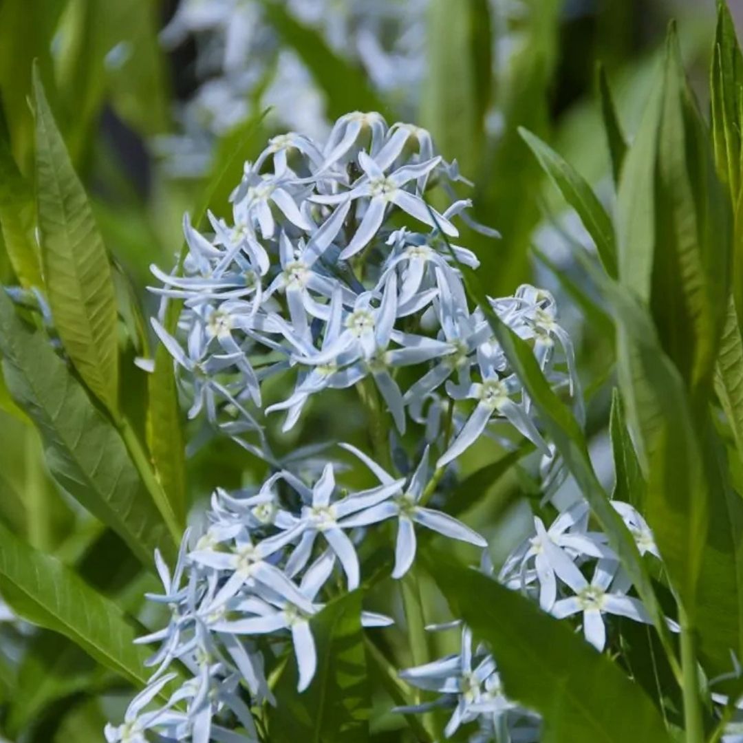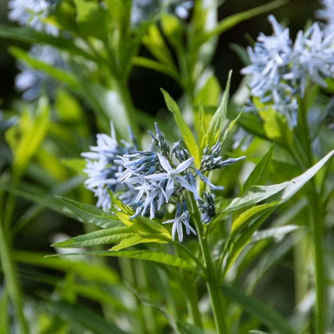 A dense and mounded selection that features narrow, ferny foliage throughout the season; soft blue, star shaped flowers bloom in clusters from late spring to early summer; foliage turns a lovely golden yellow in the fall; easy to grow and low maintenance.