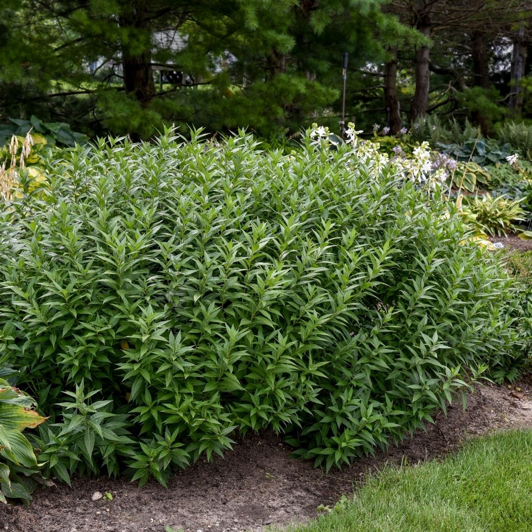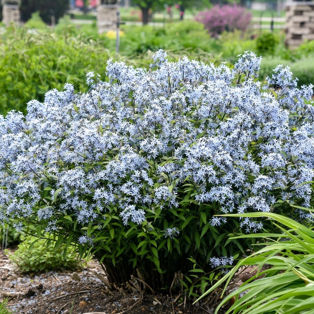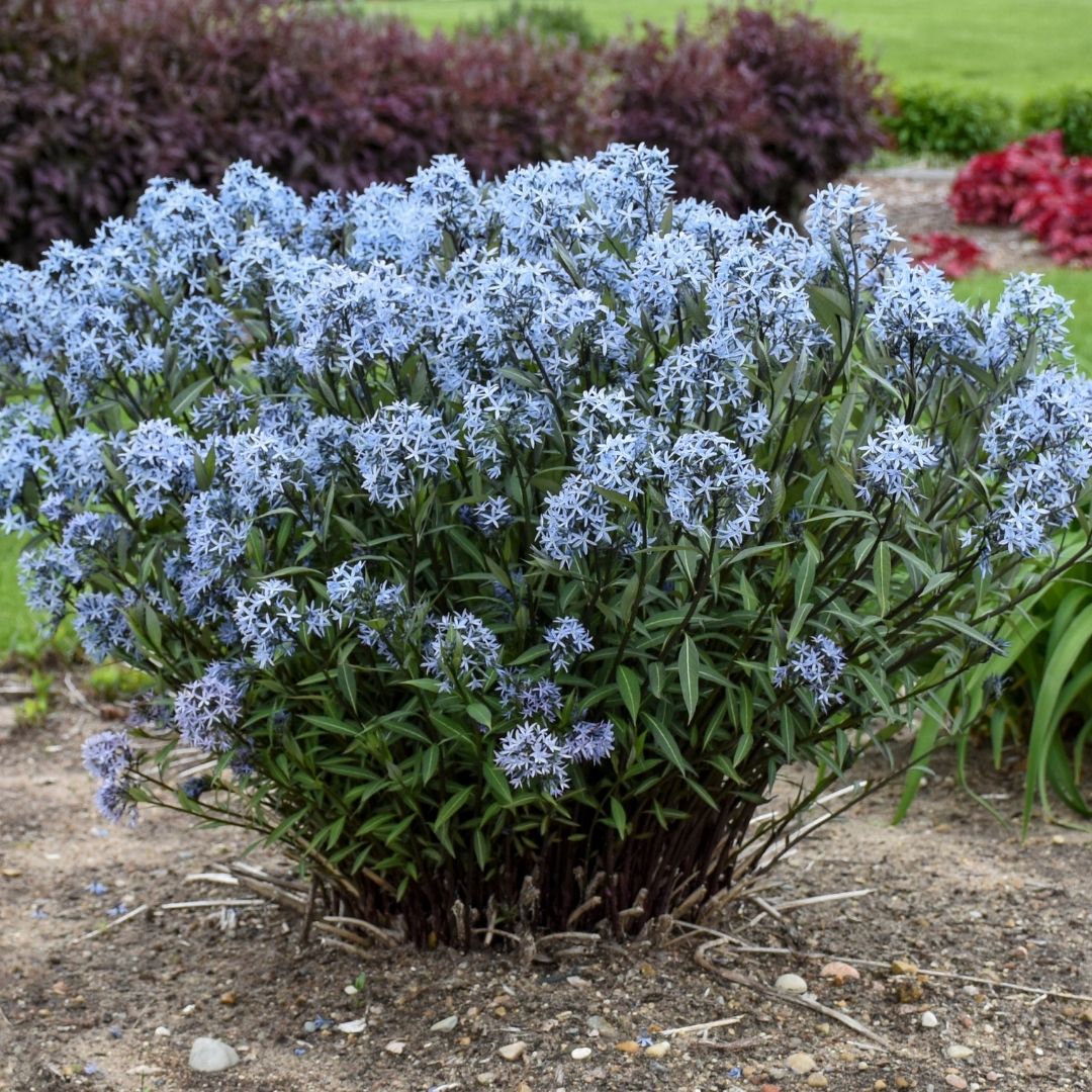Incredibly dark stems emerge from the ground in spring, producing olive green leaves with silver veins; beautiful periwinkle blue, star-shaped flowers in springtime, on a wide, mounding, shrubby habit; does best in moist, well-drained soil