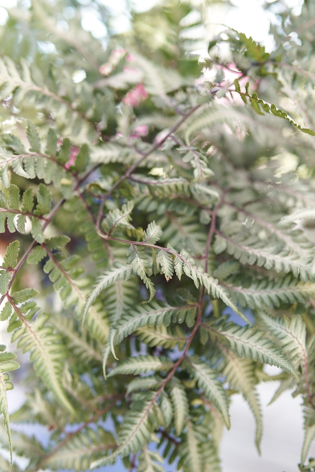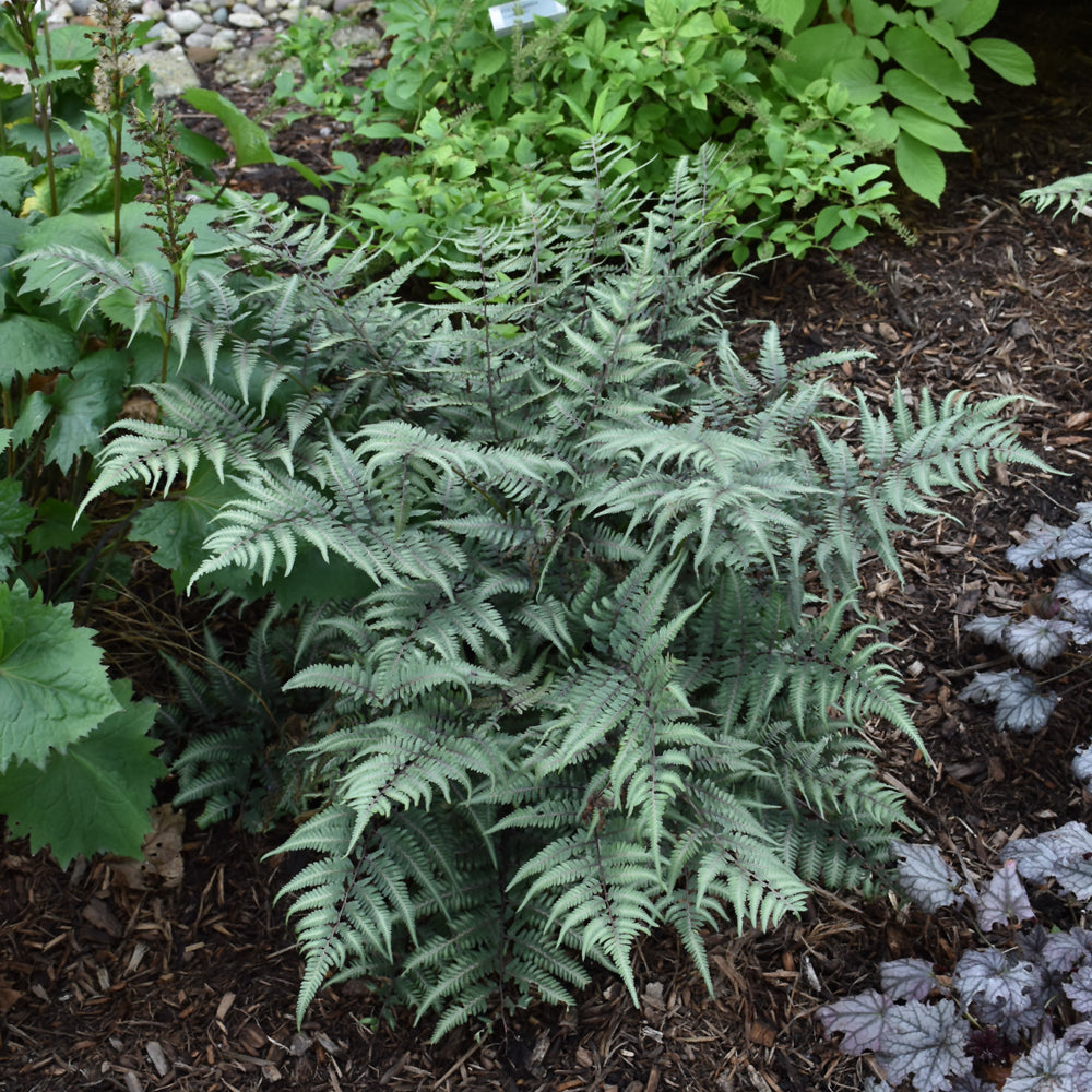 A massive, arching clump of silvery fronds with green highlights and purple stems; prefers moist, loamy soils; a great filler for shady borders