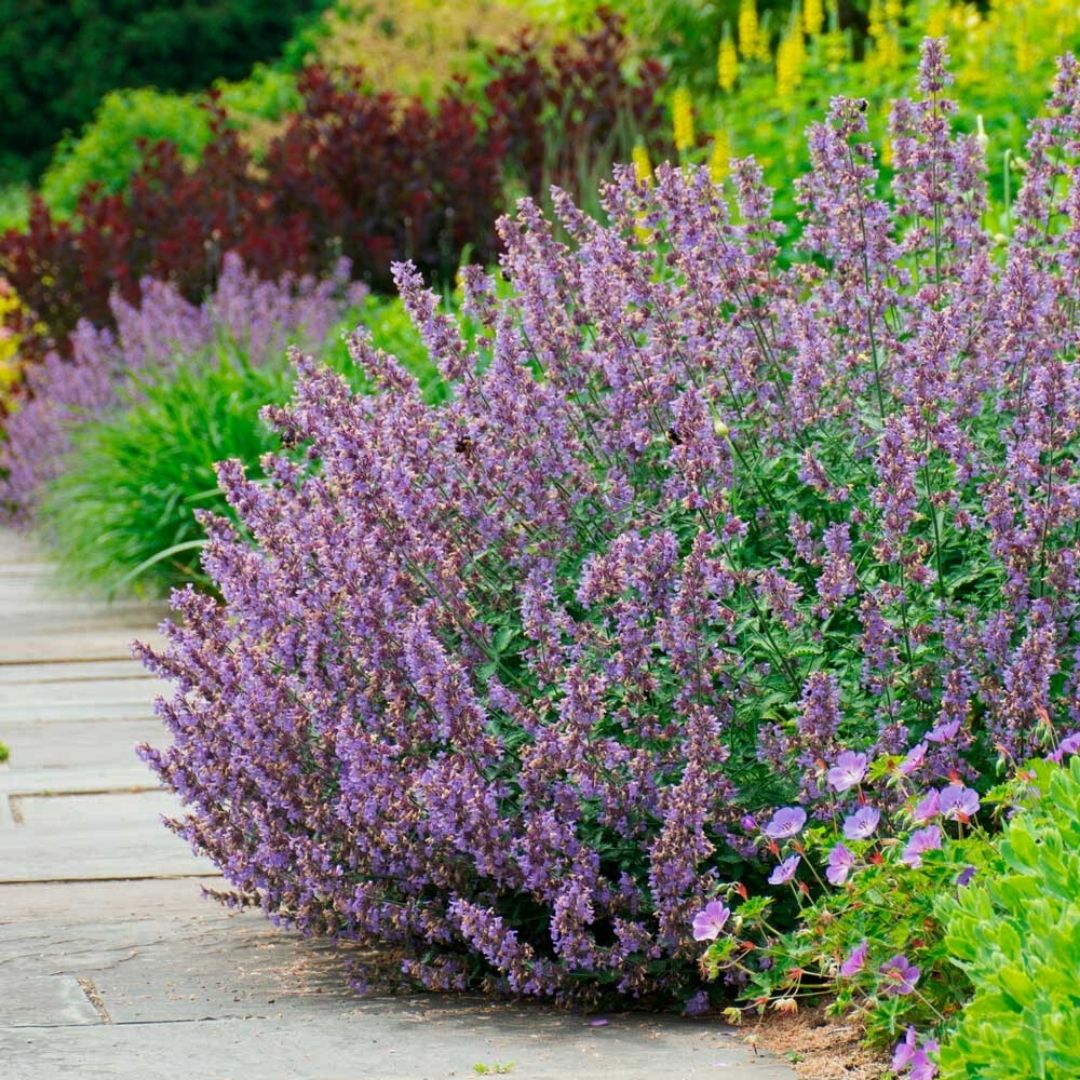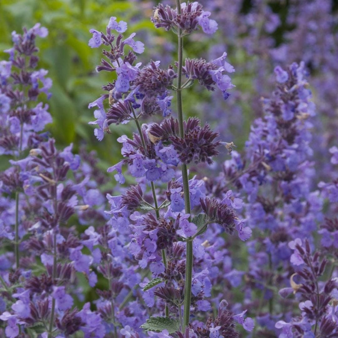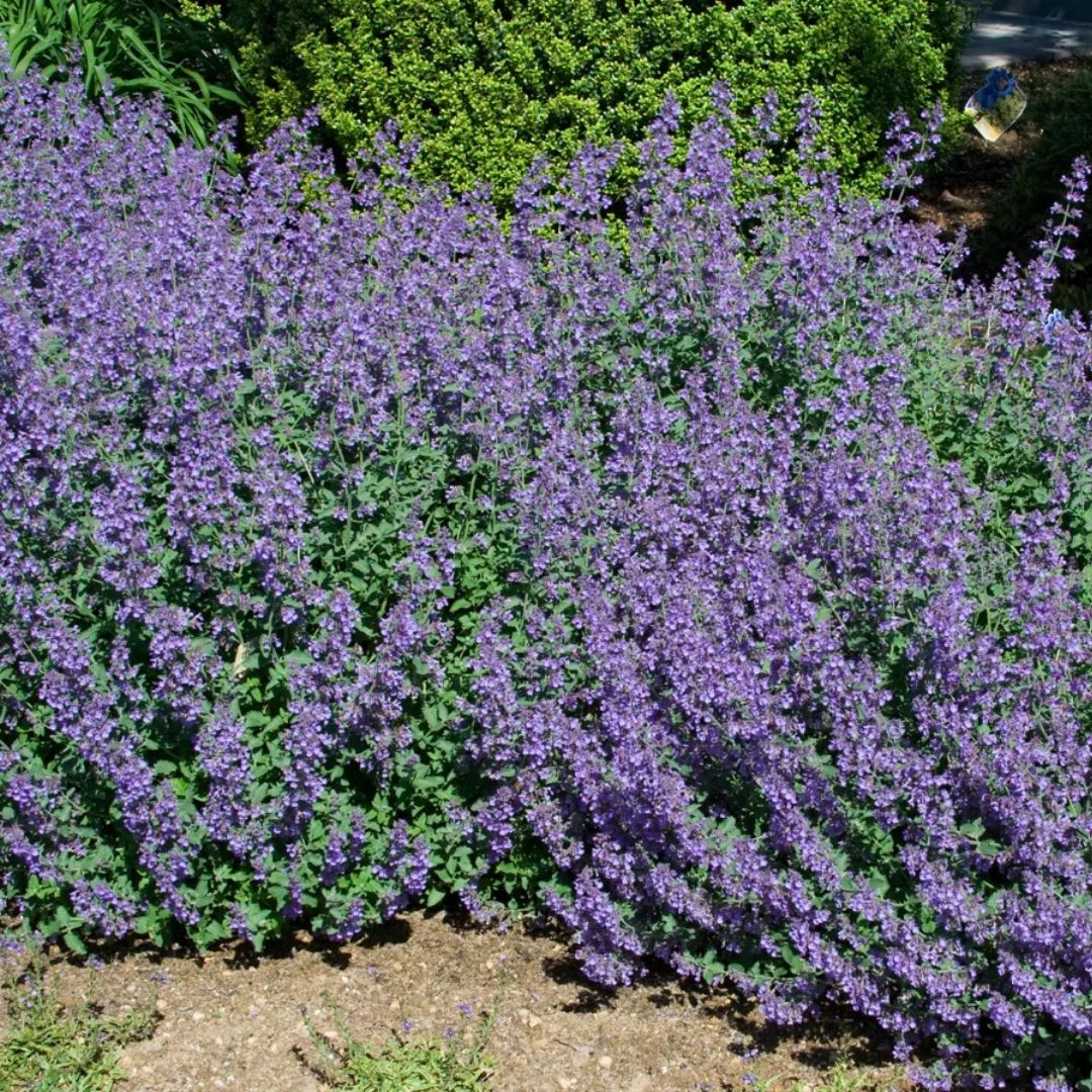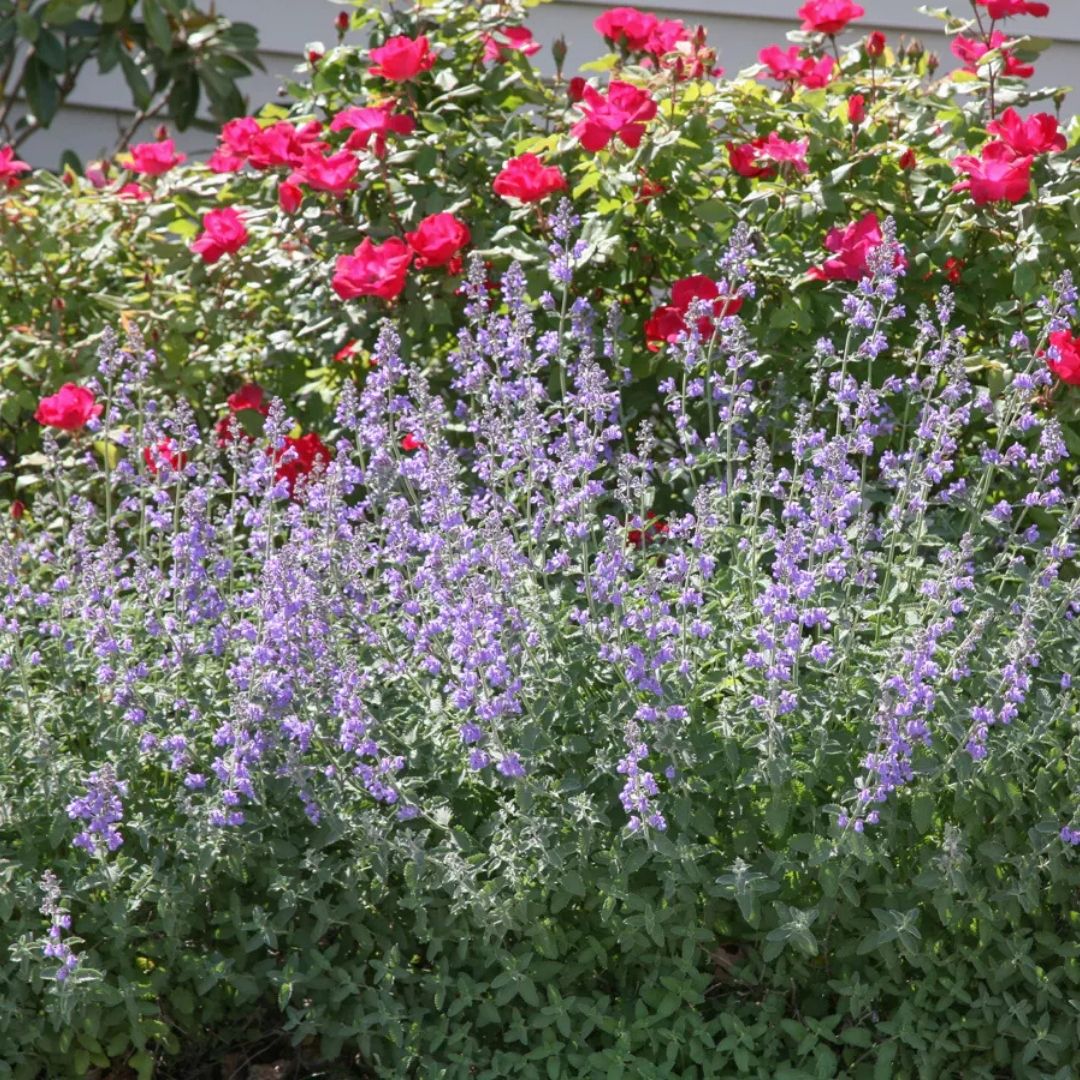 Walker's Low Catmint has masses of beautiful spikes of lightly-scented royal blue flowers with lavender overtones rising above the foliage from late spring to early fall, which emerge from distinctive rose flower buds, and which are most effective when planted in groupings. Its small fragrant pointy leaves remain grayish green in color throughout the season.