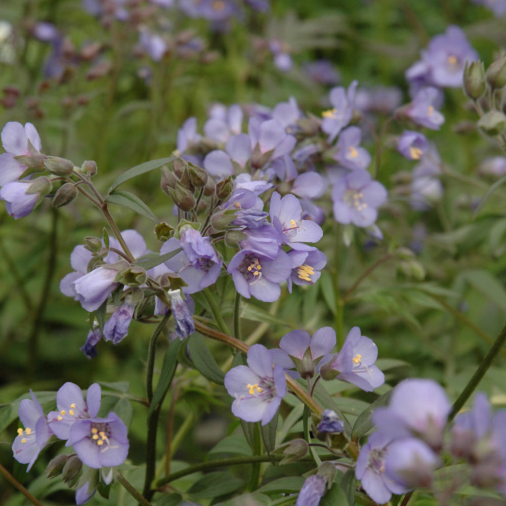 This lovely variety forms a ferny mound of green foliage that has bluish-purple highlights as new growth and is loosely topped with lilac flowers in late spring; looks great in the middle to front of the border and easily mixes with other plants.