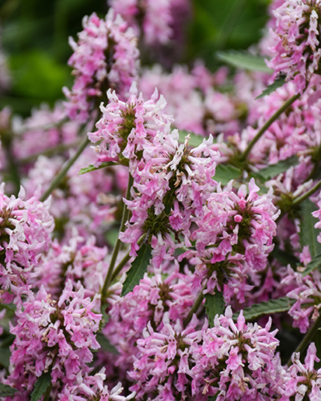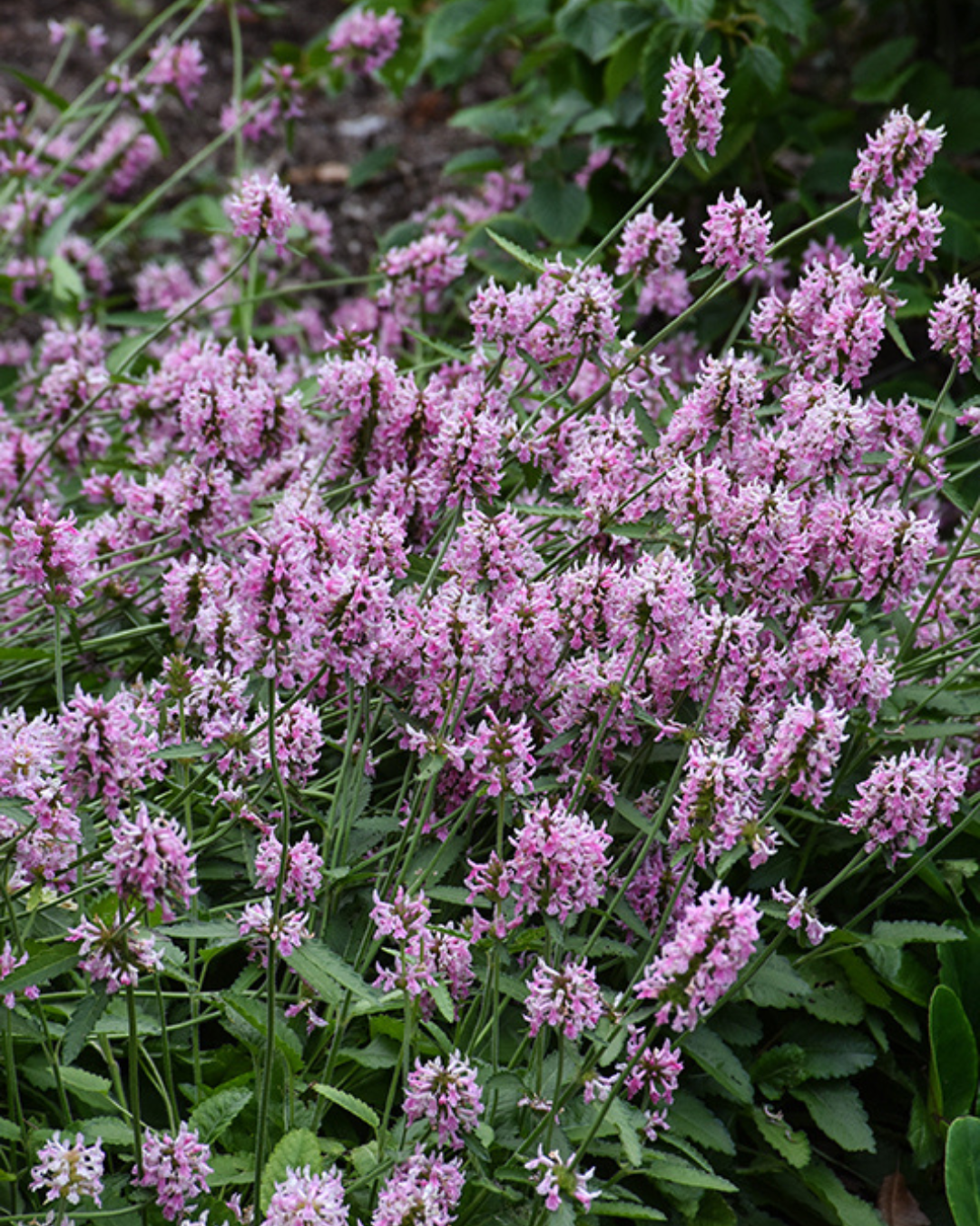 Pink Cotton Candy Betony has masses of beautiful spikes of pink tubular flowers rising above the foliage from early to mid summer, which are most effective when planted in groupings. Its serrated heart-shaped leaves remain forest green in color throughout the season.