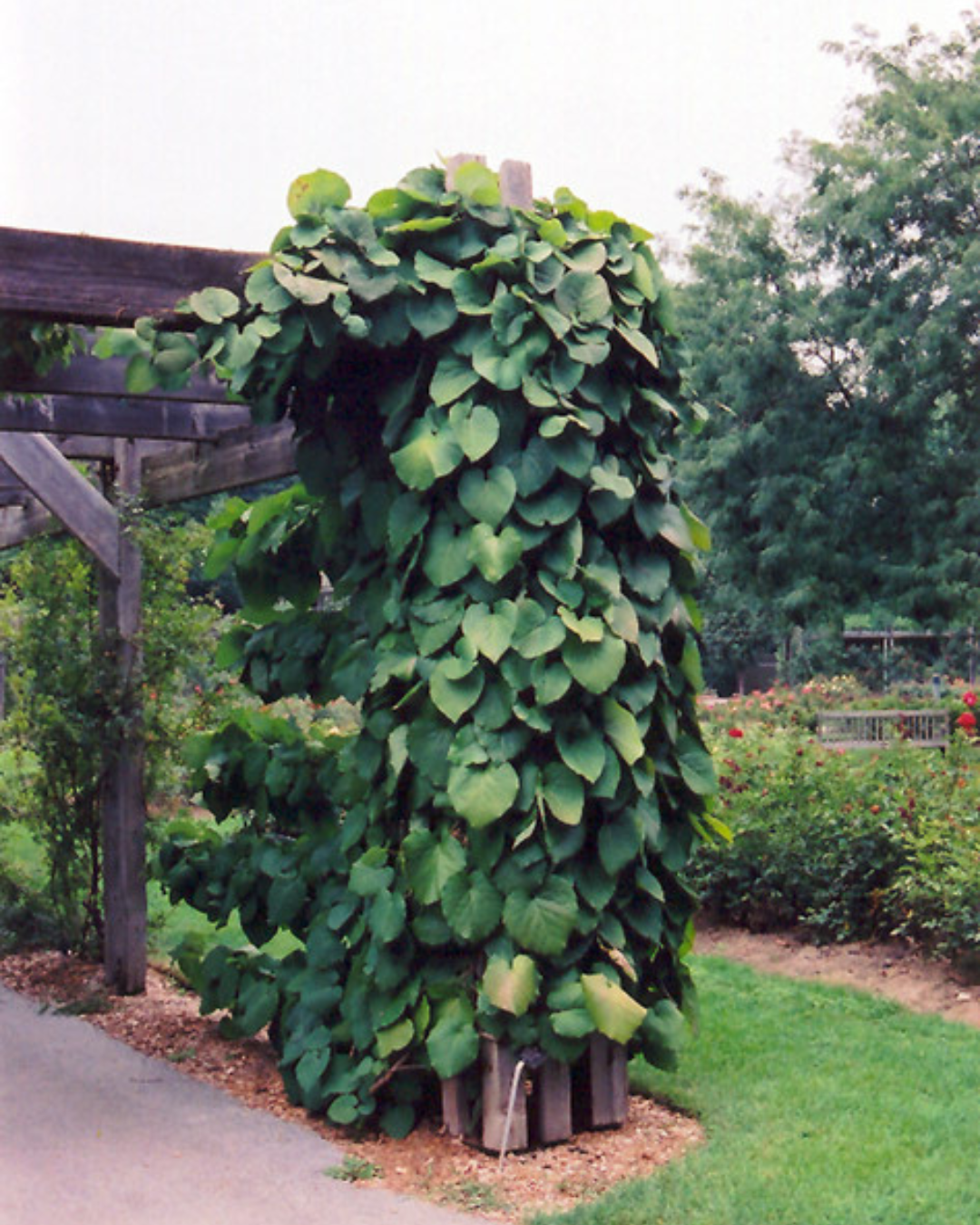An extremely vigorous vine, excellent for quick screening, almost invasive; highly interesting purple flowers and oddly shaped fruit, often lost in the foliage; large leaves provide good shade for pergolas or arbors
