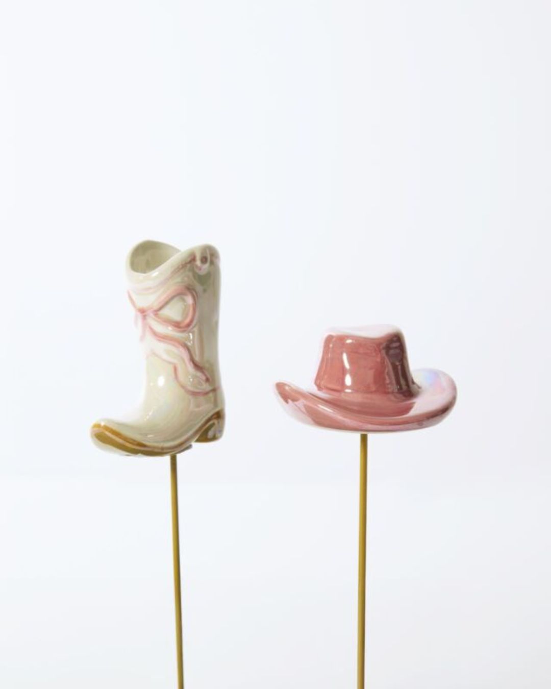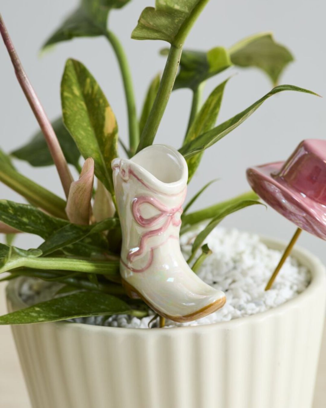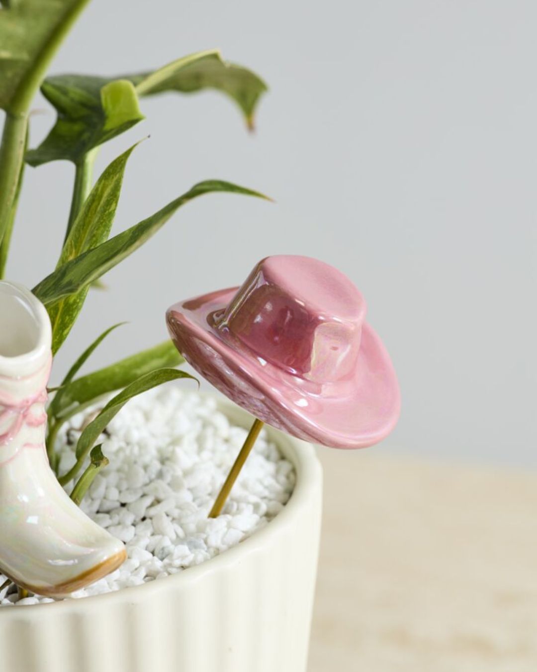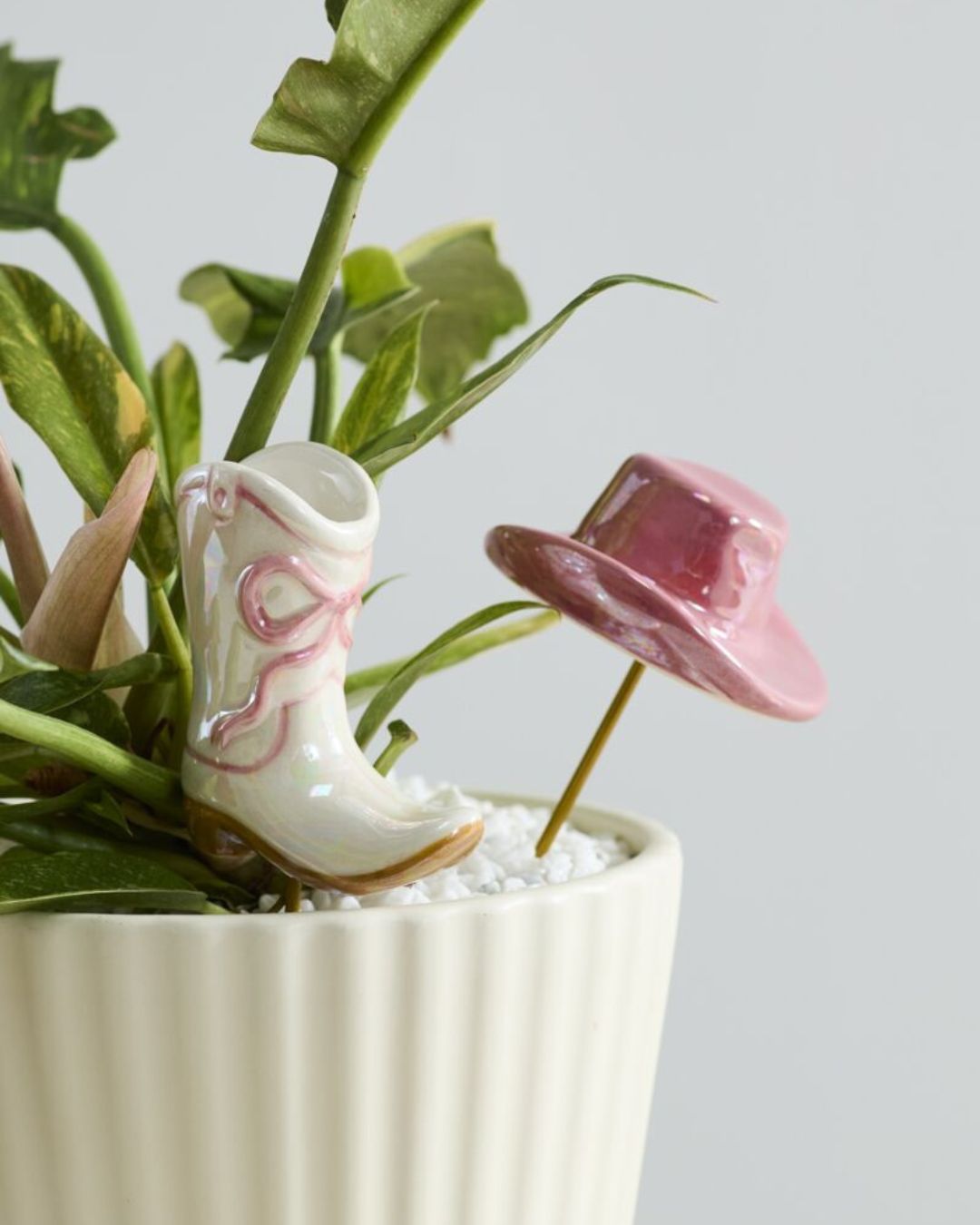 Get on the western bandwagon with the Giddy Up Plant Sticks, a charming ceramic set including a pink iridescent cowgirl hat and glossy white boot with pink bow. These on-trend, playful plant sticks make the perfect add on to any plant shop purchase.