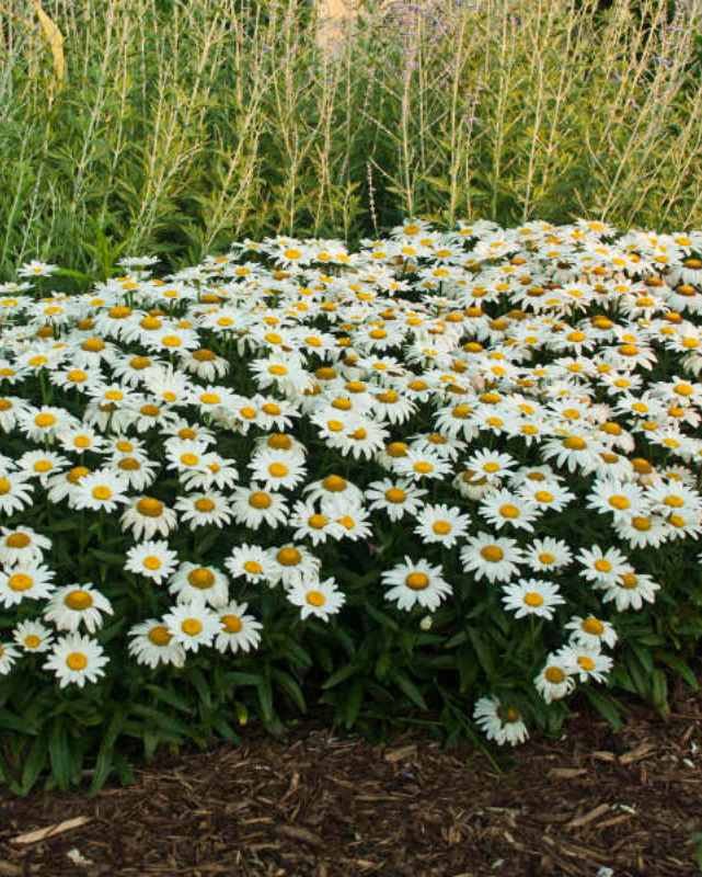 A delightful variety of the ever-popular shasta daisy known for a high bloom rate; abundant beautiful white blooms with yellow eyes rise above and graciously contrast the deep green foliage; wonderful choice to mass as a garden focal point