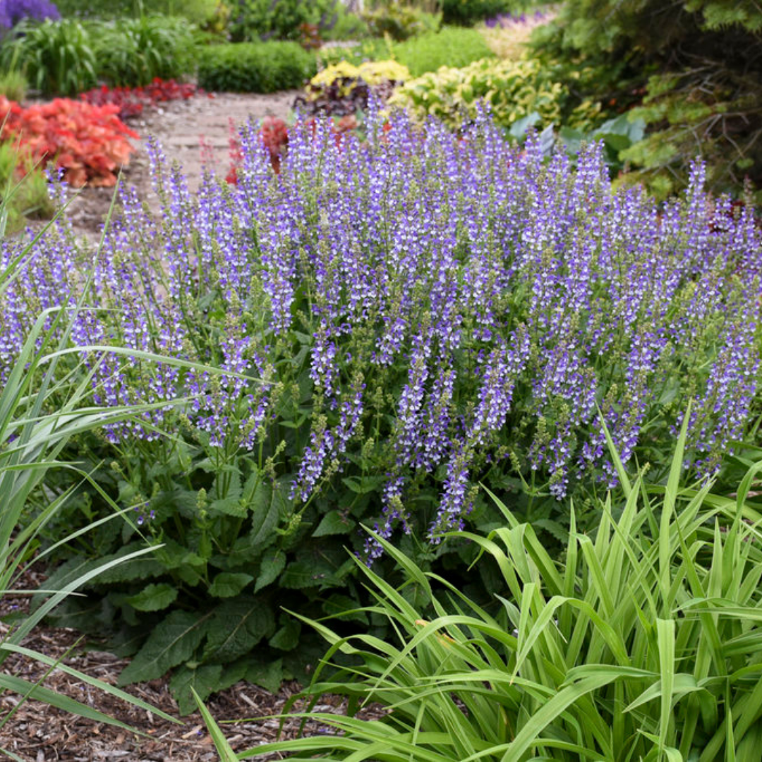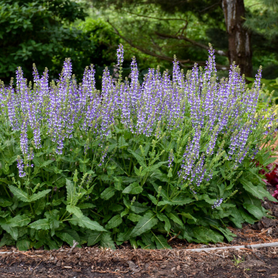 Color Spires® Azure Snow Sage has masses of beautiful spikes of violet flowers with white overtones rising above the foliage from late spring to early summer, which are most effective when planted in groupings. The flowers are excellent for cutting. Its attractive fragrant pointy leaves remain green in color throughout the season.