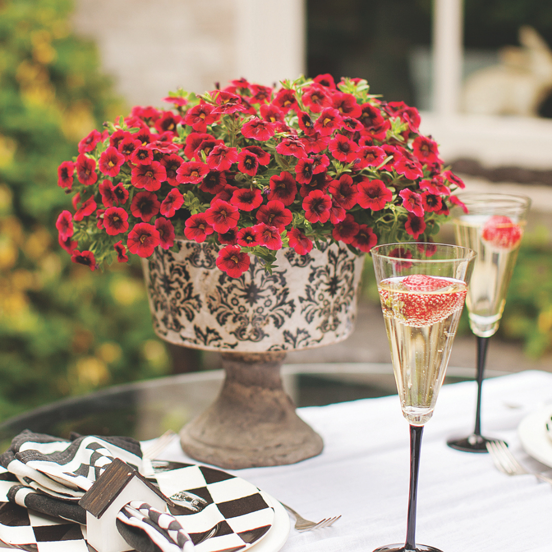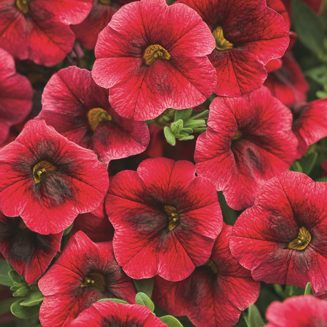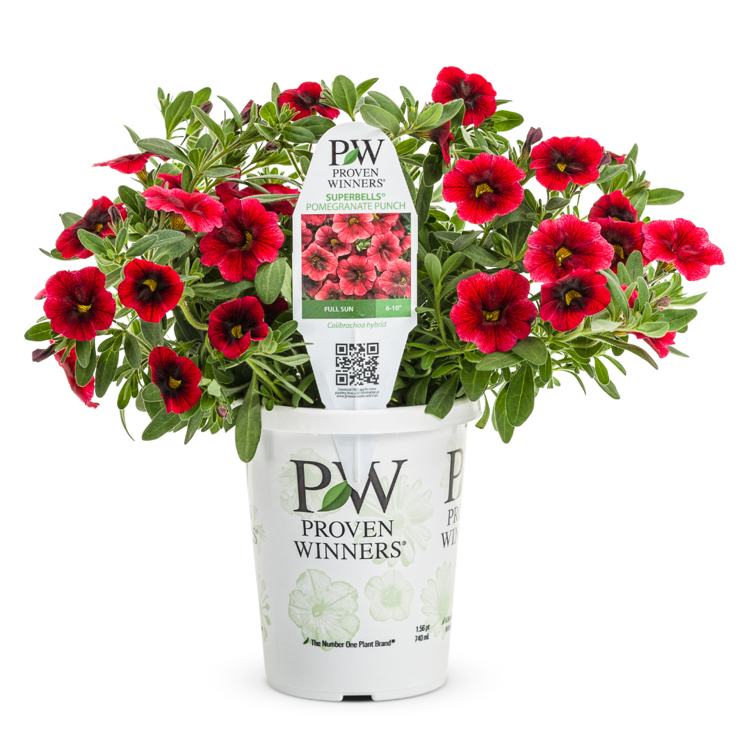 Superbells® Pomegranate Punch™ Calibrachoa is bathed in stunning red trumpet-shaped flowers with yellow throats and brick red centers at the ends of the stems from late spring to early fall. Its small pointy leaves remain green in color throughout the season.