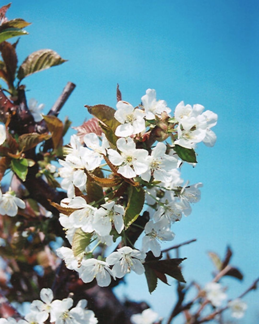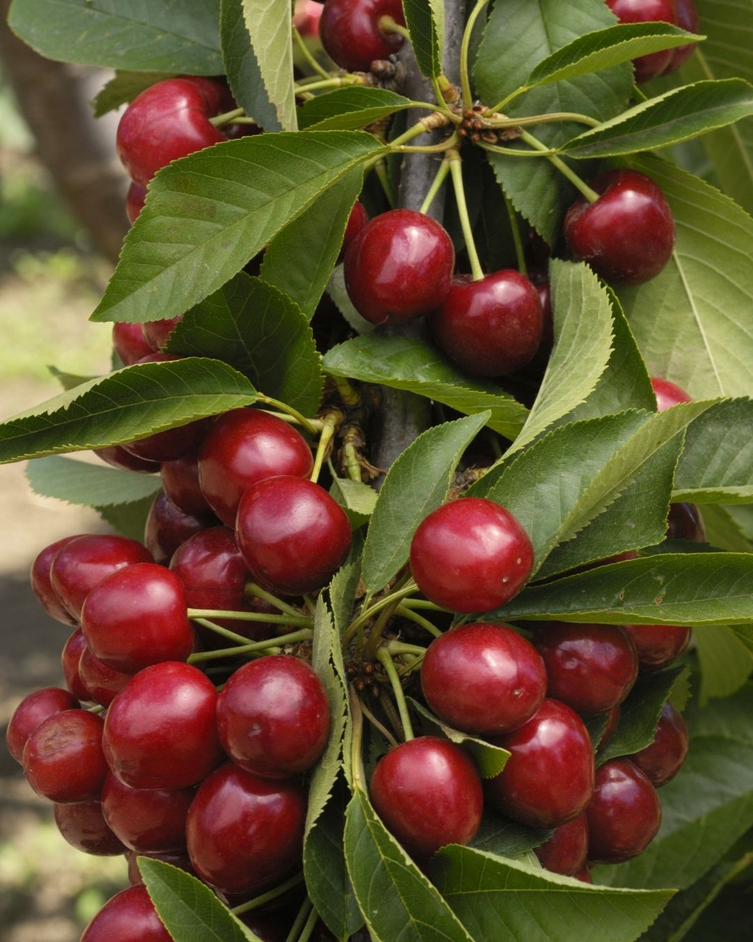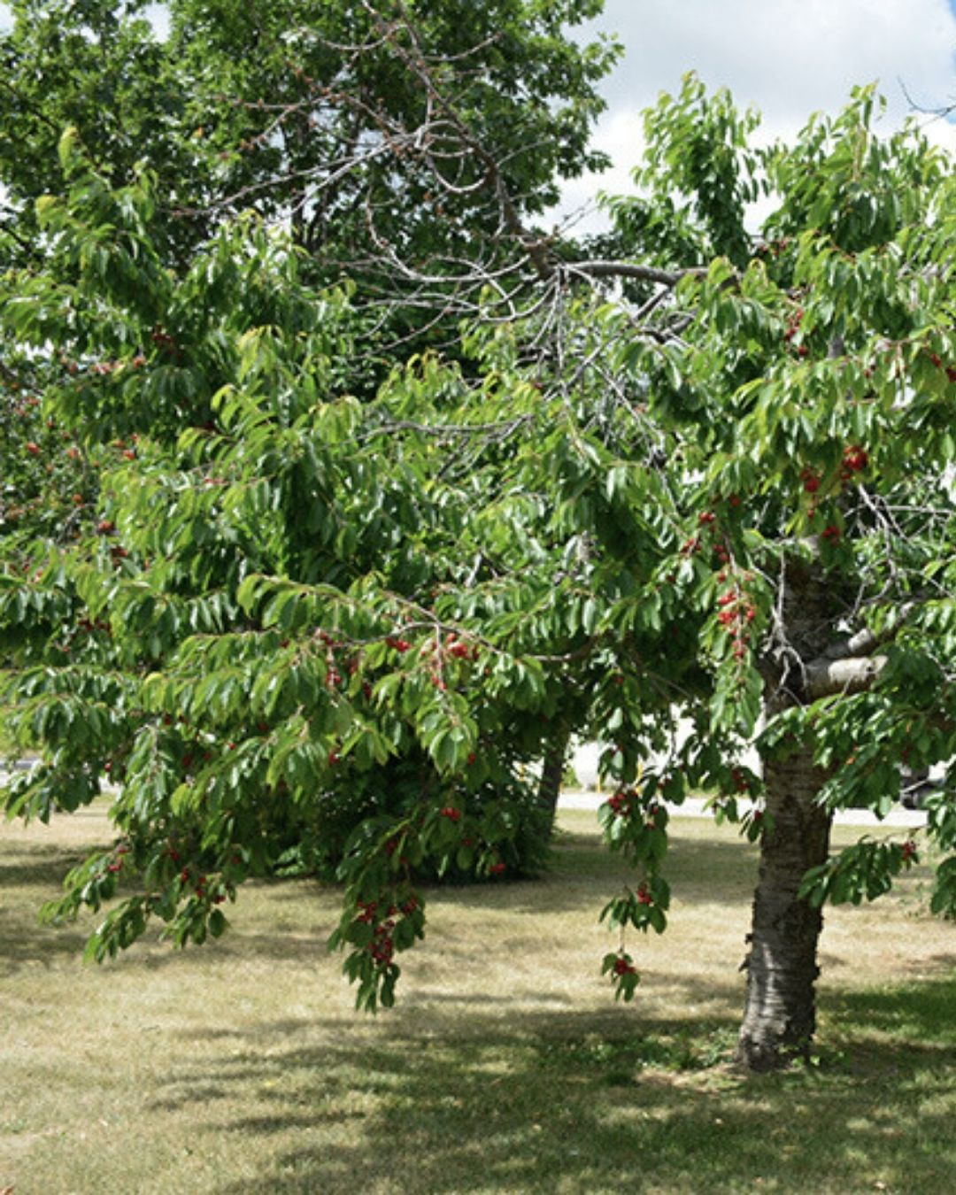 The most common commercial cherry variety featuring showy white flowers in spring followed by sweet deep red fruit, tall and upright, best for larger landscapes; needs full sun, well drained soil and a pollinator, be prepared to fight the birds for fruit