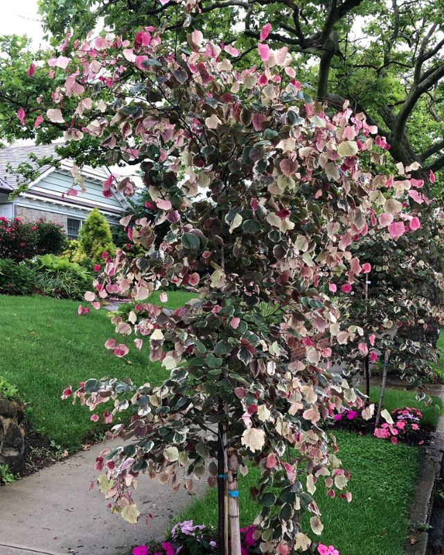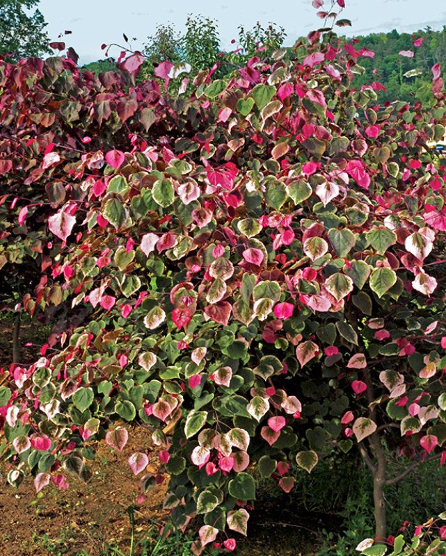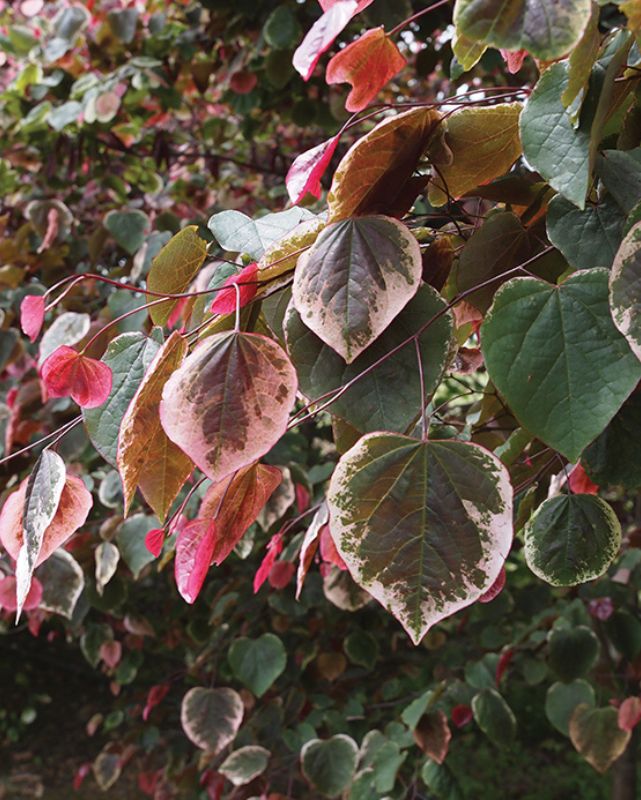 Description: Carolina Sweetheart® has pink flowers, followed by attractive, variegated foliage. Rich maroon leaves spread out in early spring, eventually becoming green with white margins. It displays the elegant, broad, heart shaped leaves expected from a redbud tree.