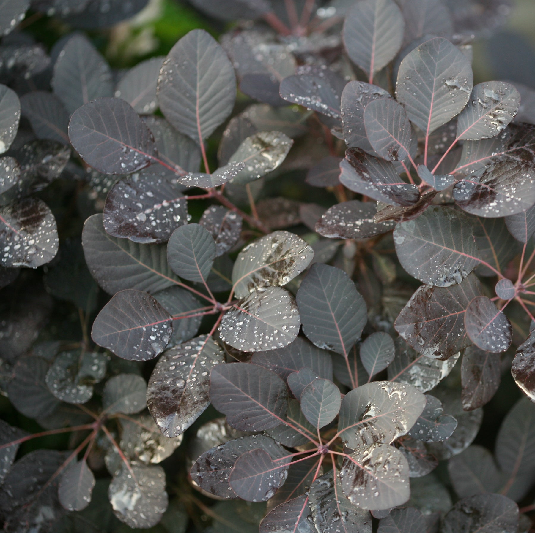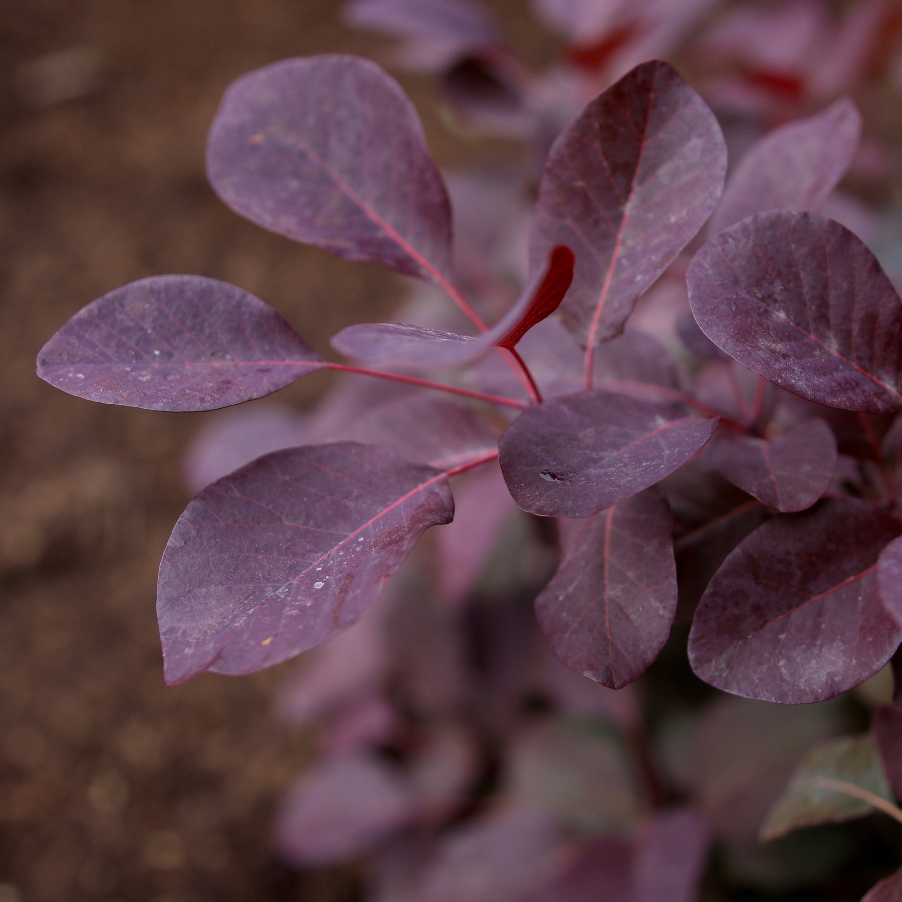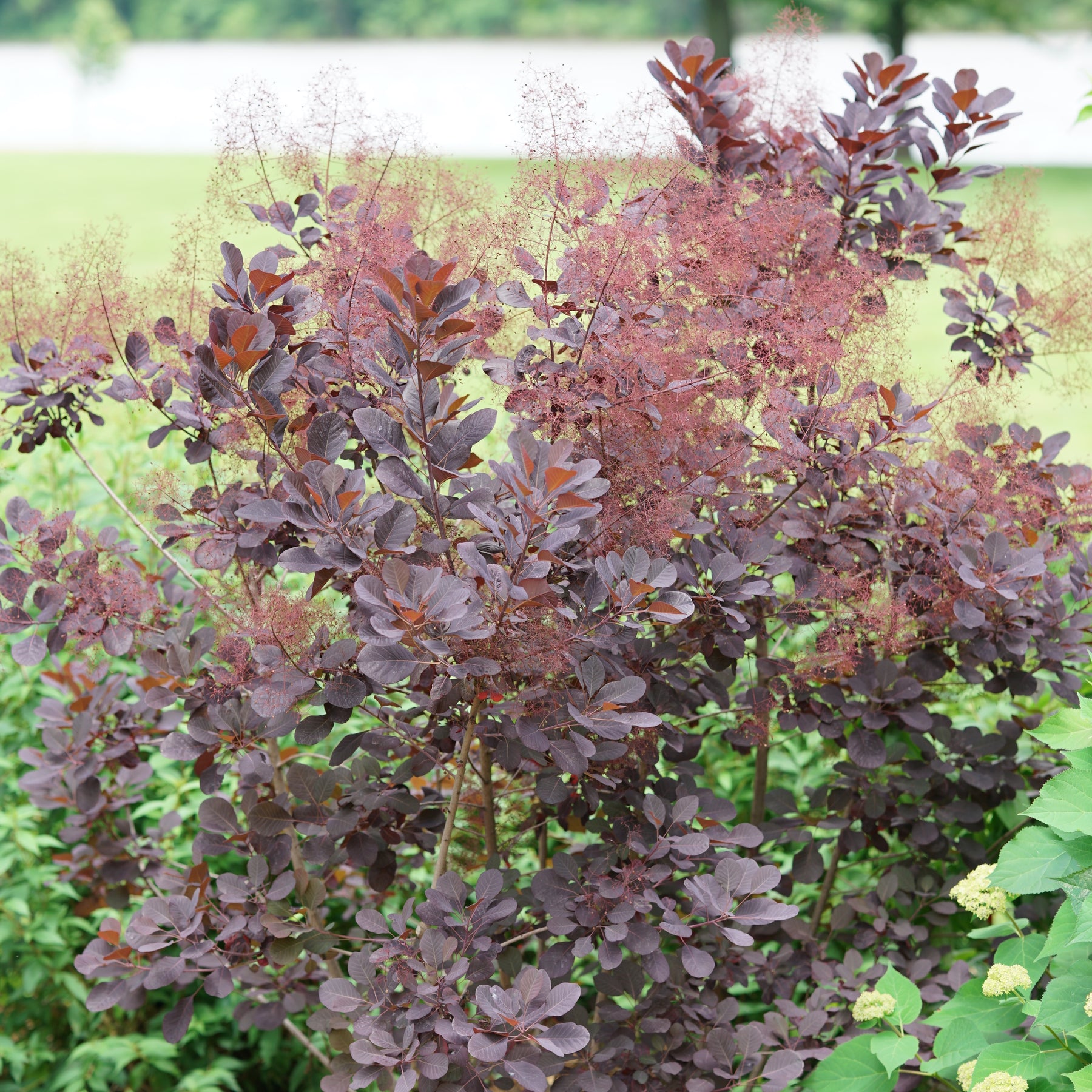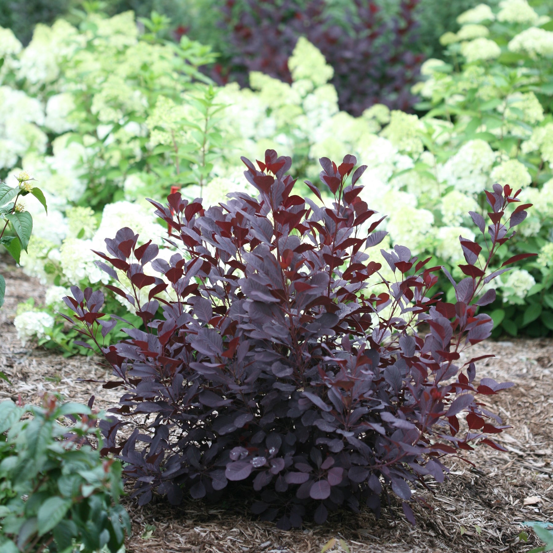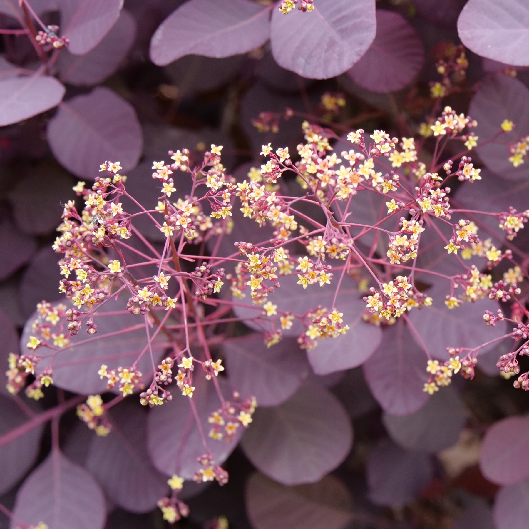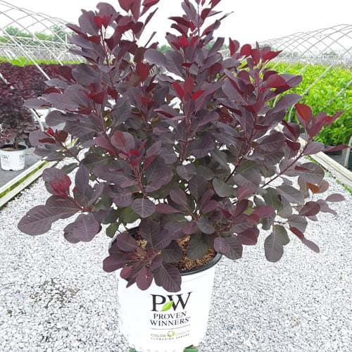 Foliage on this outstanding dwarf variety emerges rich purple, progresses to deep near-black as summer heat comes on, then lightens up in shades of red and orange in fall; large, soft panicles of bloom in early summer has the appearance of smoke.