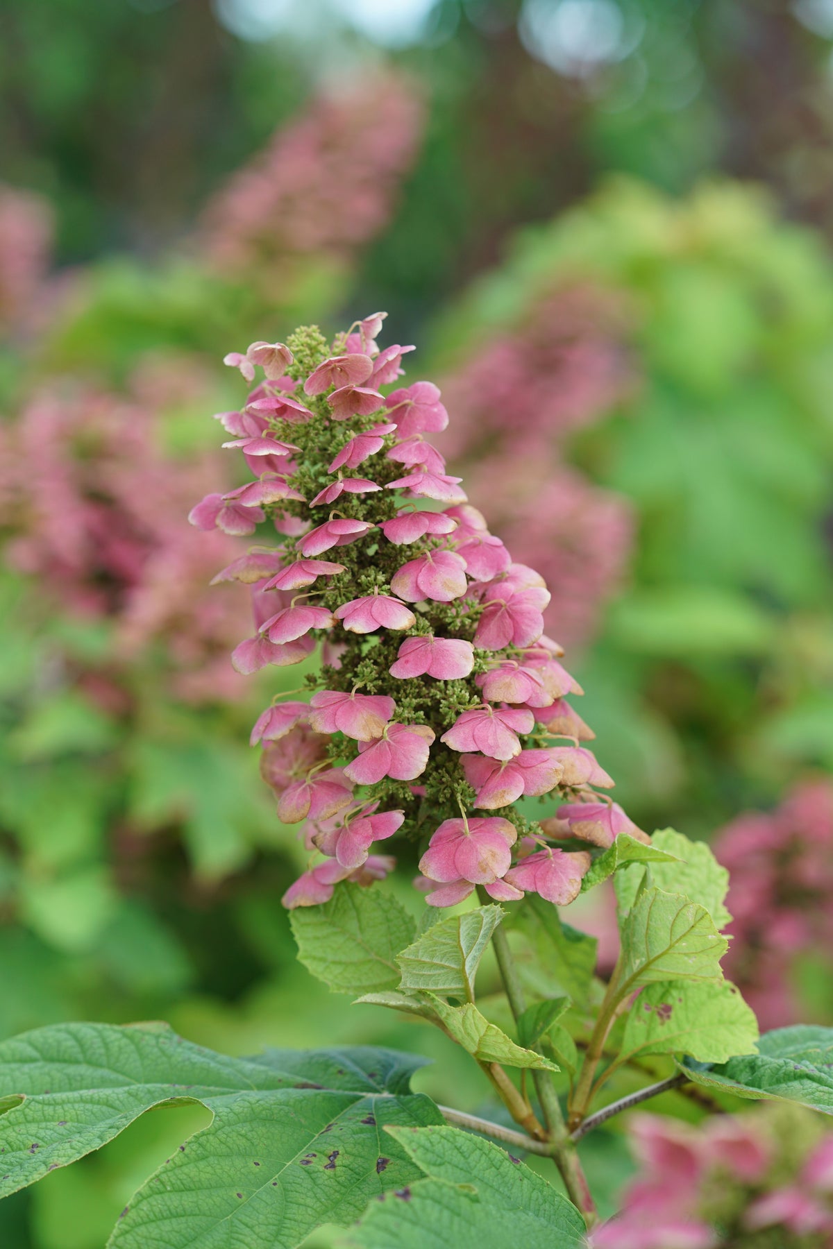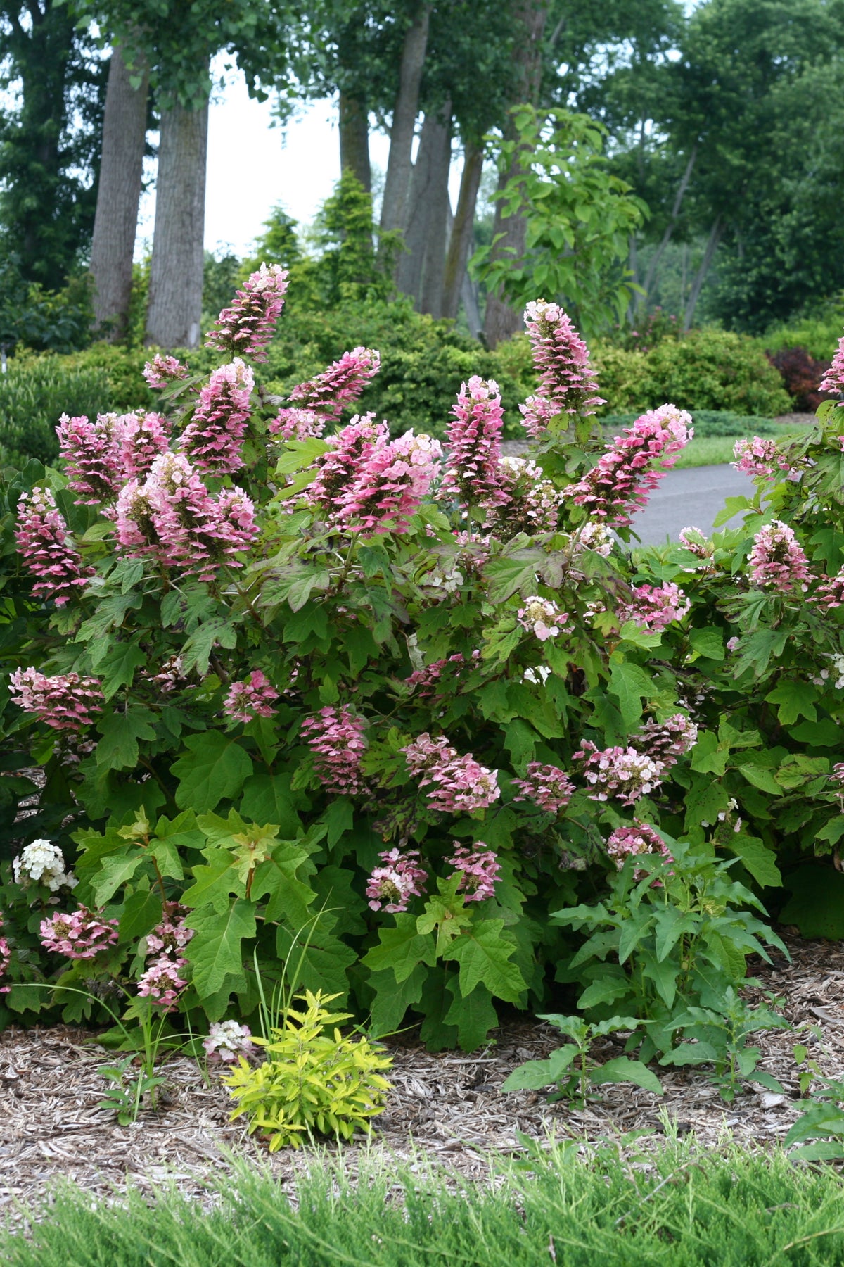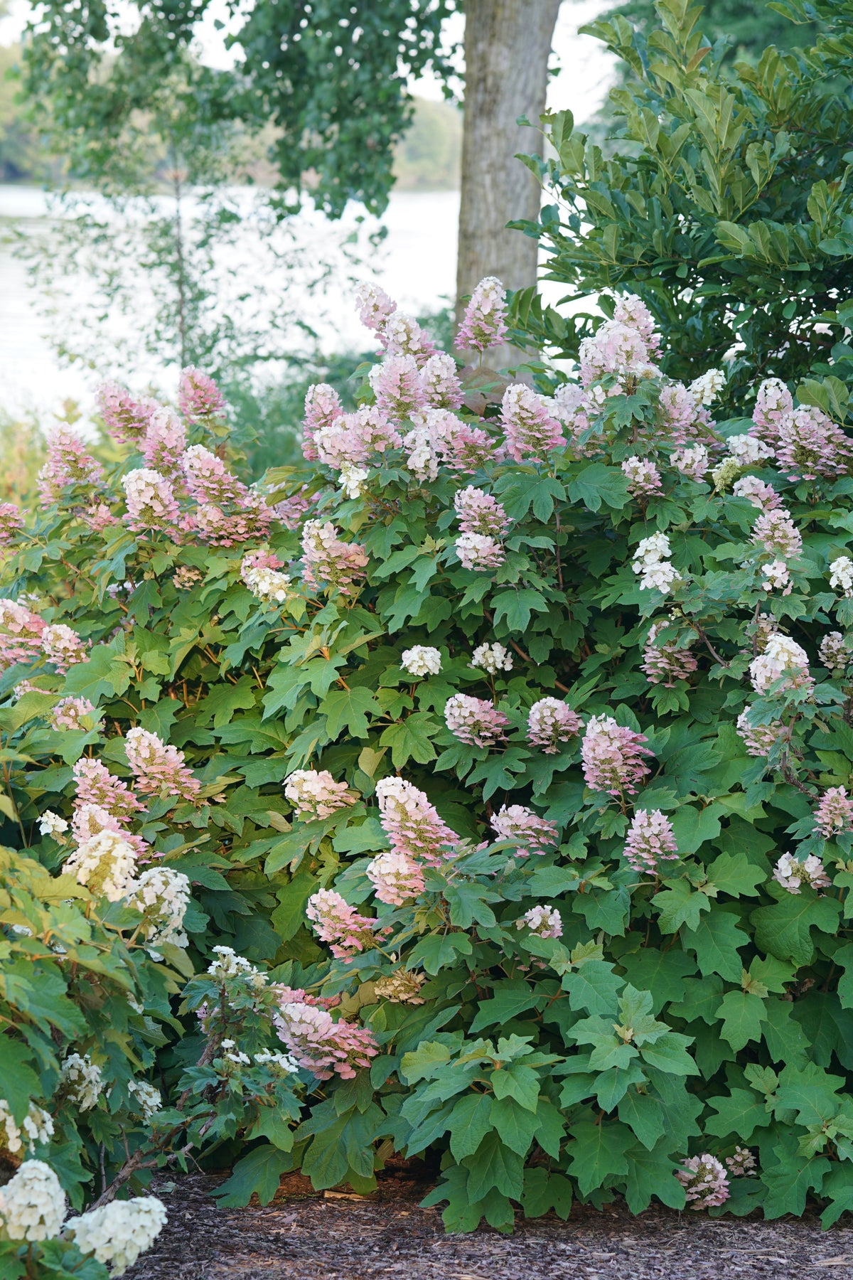 A distinctive oakleaf hydrangea featuring big, showy, white blooms that quickly transform to deep pink; burgundy fall foliage color; blooms on old wood; a great selection for gardens and borders.