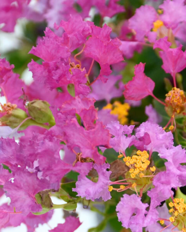Bellini® Grape Crapemyrtle is clothed in stunning panicles of purple frilly flowers at the ends of the branches from late spring to late summer, which emerge from distinctive red flower buds. It has dark green deciduous foliage. The glossy oval leaves turn orange and yellow in fall.