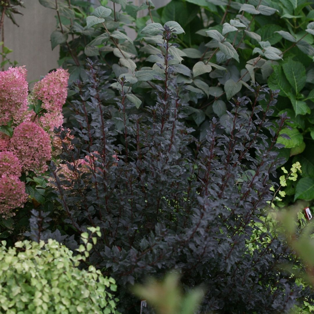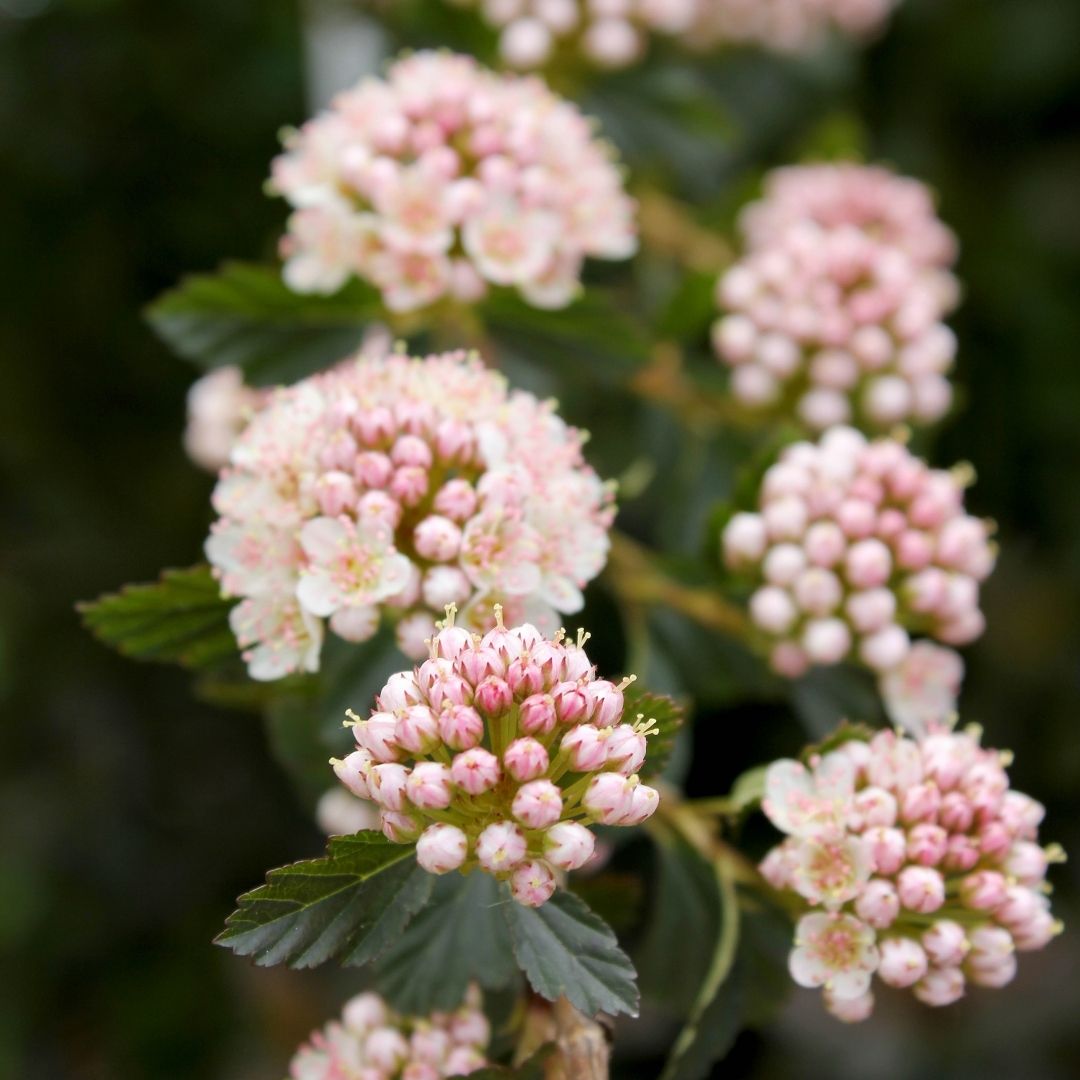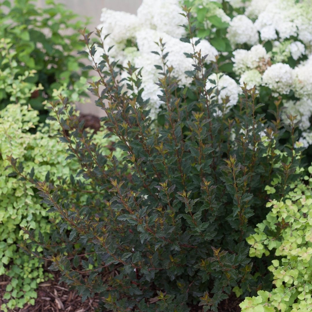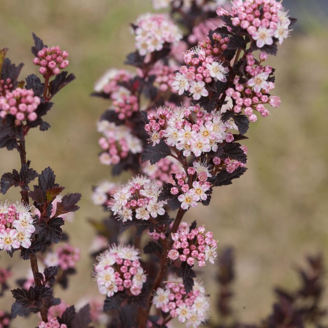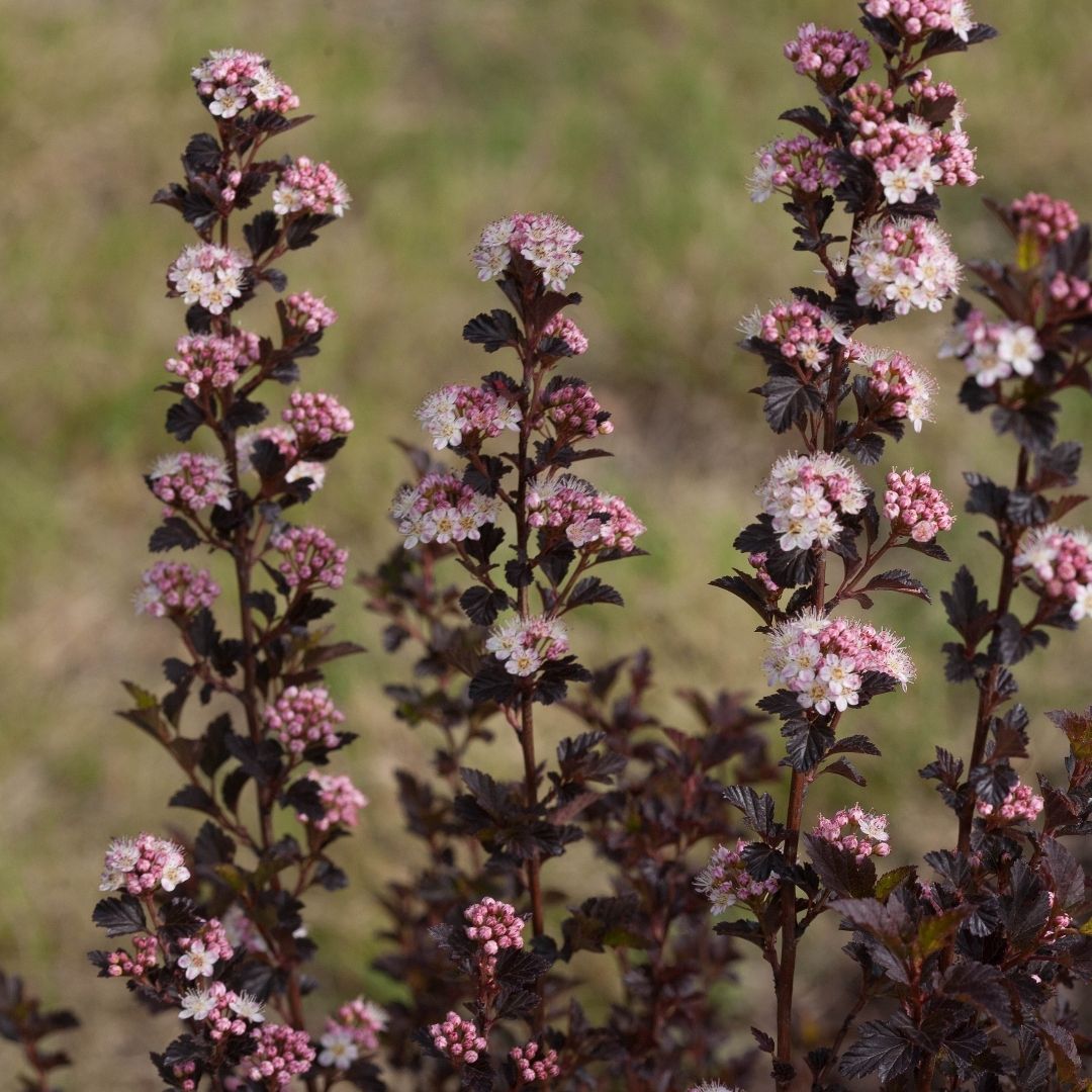 This stunning garden shrub is a significantly more compact variety; foliage emerges a wine-red and matures to a deep reddish-purple, contrasting the showy white flowers in spring; also has interesting peeling bark; an excellent choice for a smaller area