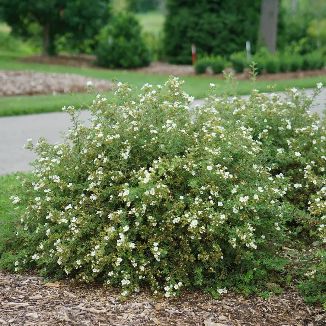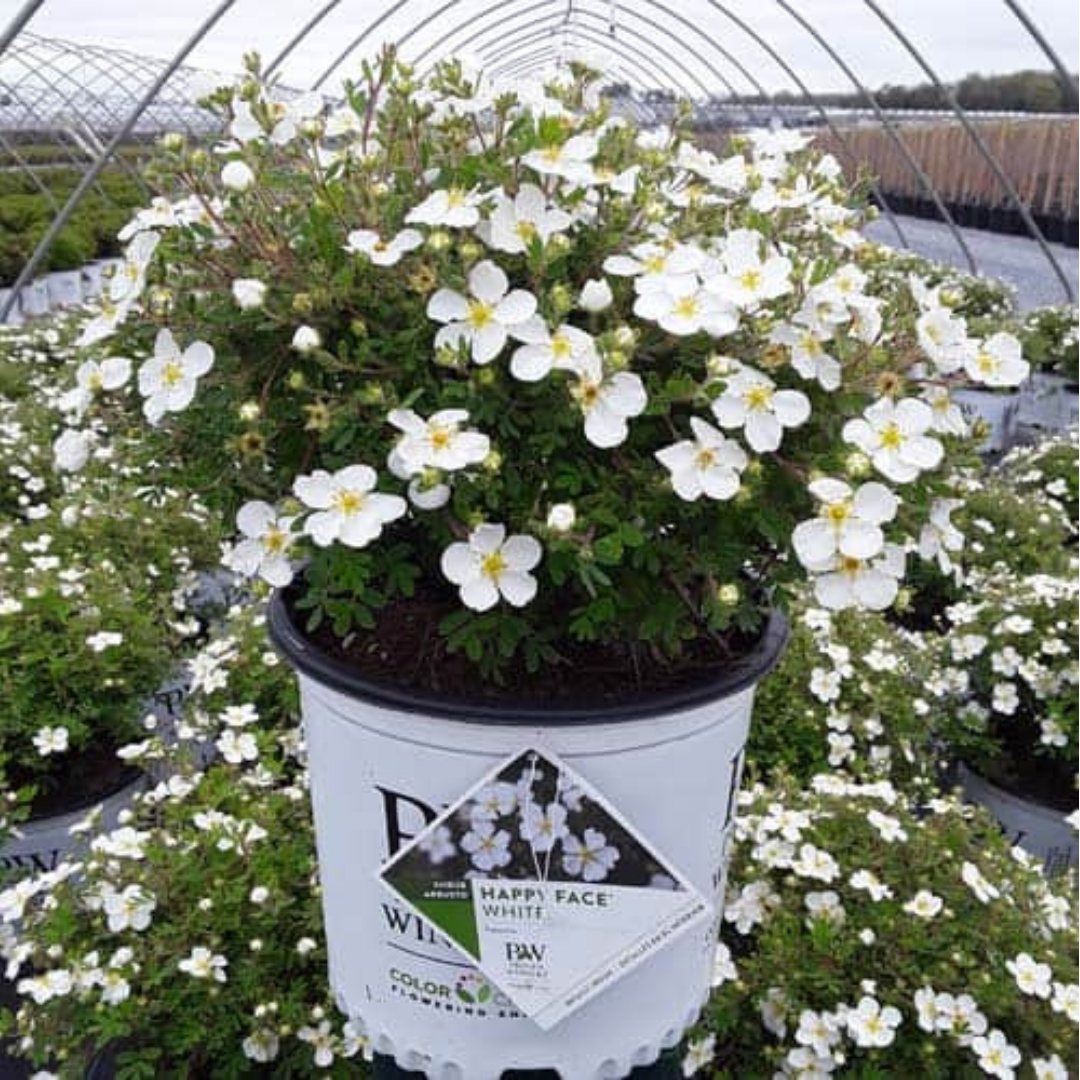 Happy Face® White Potentilla has white flowers with gold eyes at the ends of the branches from late spring to early fall. It has dark green deciduous foliage. The small ferny compound leaves do not develop any appreciable fall color.