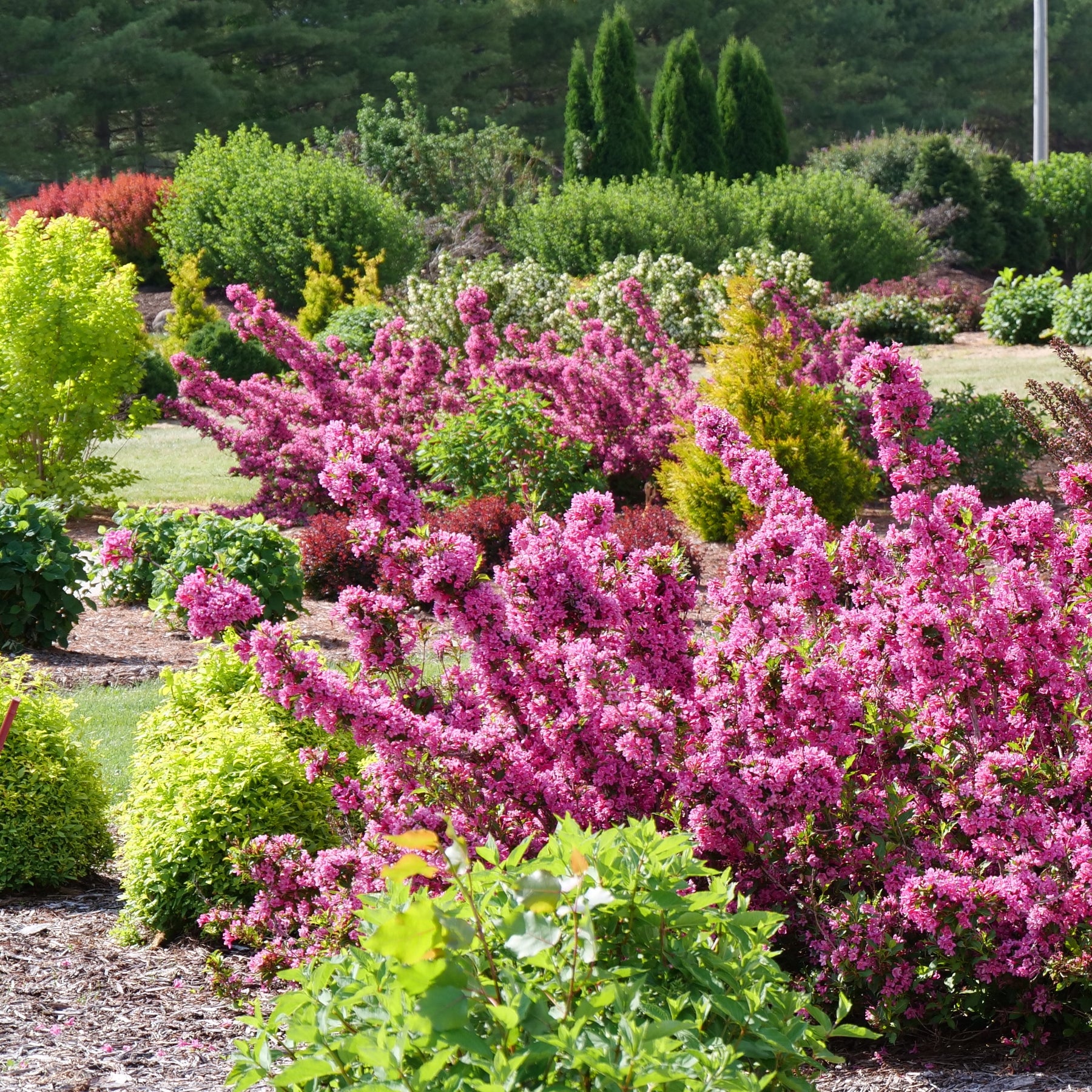 This is a magnificent cultivar that forms a stately mounded shrub with rich glossy green foliage; contrasting pink trumpet-shaped flowers rebloom all season and attract hummingbirds; ideal for the mixed garden border.