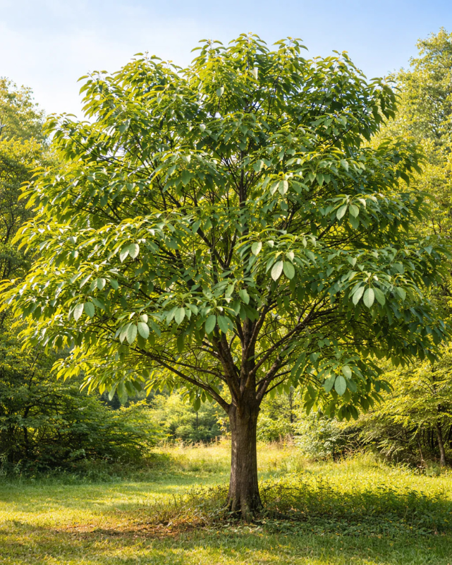 Common Paw Paw is a small tree that is typically grown for its edible qualities, although it does have ornamental merits as well. It produces large green oblong fruit with creamy white flesh which are usually ready for picking from mid to late summer. The fruits have a sweet taste with a mushy texture and a pleasant fragrance.