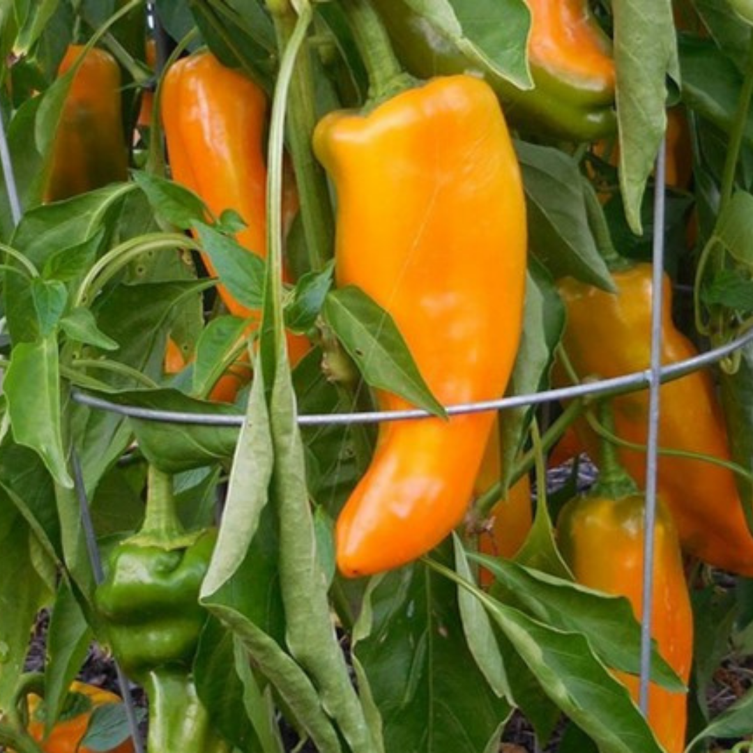 Description: This award winning Italian Sweet Pepper has bright golden yellow skin and nice sweet flavor, great for fresh eating, grilling or roasting.  The compact bushy plant produces more than 2 dozen, 7-9-inch-long, 2-4 ounce tapered peppers.  These peppers are juicy, rich and meaty with great texture and skin that peels away easily.  The compact 24” plant is ideal for small spaces or patio containers.  Early maturing and easy to grow Mama Mia peppers should be harvested when completely yellow.