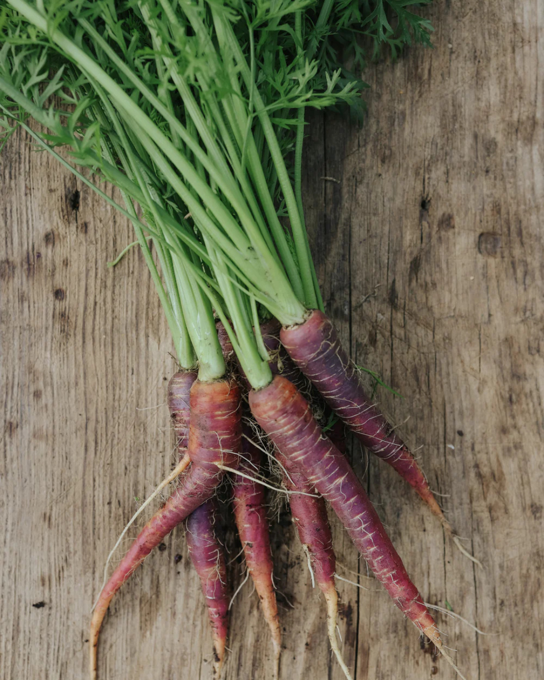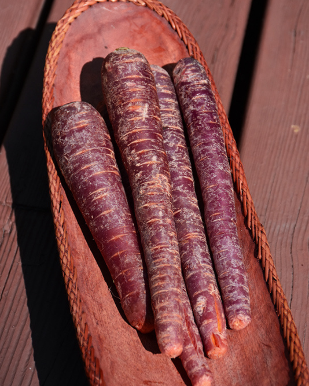 Description: Purple Haze is a truly unique carrot. It has a deep purple exterior and bright orange interior. The orange also forms distinct stripes along the outer edges. Slices are stunning, there is a halo of purple around the bright orange center. The long tappered carrots grow to 7-8 inches long, and their taste has been described as sweet and crisp, and of course have the crunch of a true carrot. This fabulous carrot can be eaten raw, cooked or juiced and will add color to any dish.