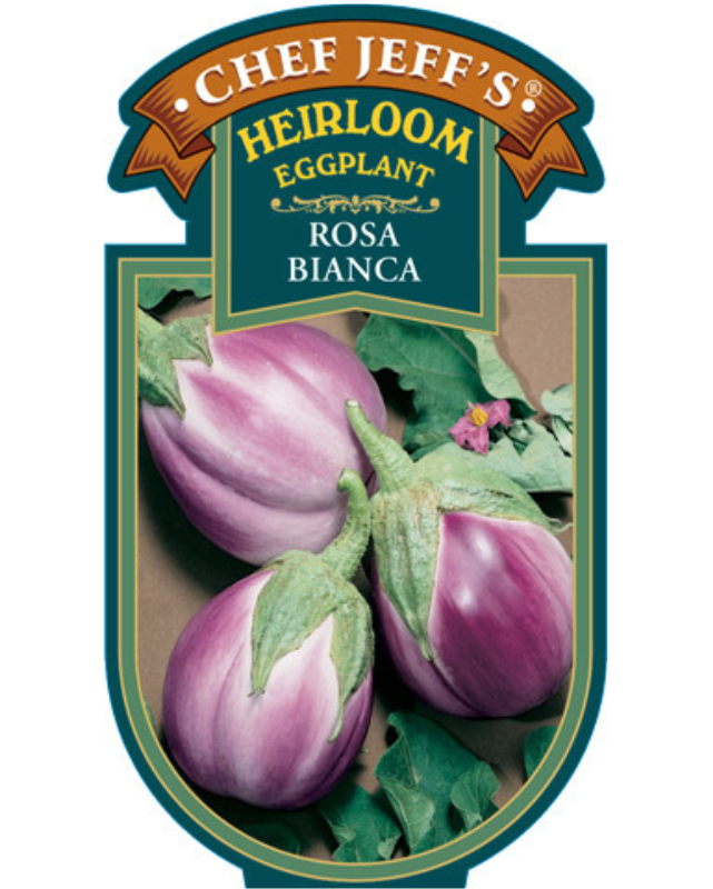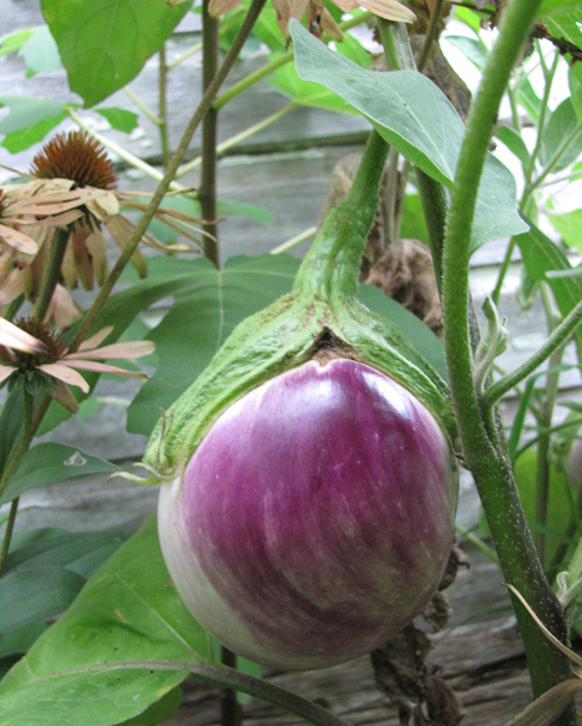Description: This Italian heirloom eggplant is almost too pretty to eat! The round teardrop-shaped fruit has lavender-rose skin with white streaks, and the flesh has incredible taste. Beautiful, plump 3 to 4 inch by 5 inch, 2 to 4 pound fruit is narrow at the top widening with indentations almost in folds like fabric.