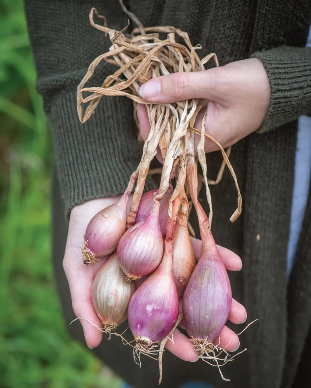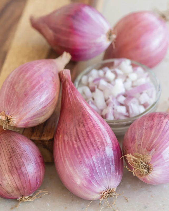 Description: Shallots have a mild taste that combines the flavor of a sweet onion with a touch of garlic. They are rarely hot and are a good substitute for onions in recipes where a milder flavor is desired. Shallots can be used whenever green onions are called for and the green leaves of shallots can be used like chives. Easy to grow and one bulb will produce a cluster of 5-10 cloves. Plant will produce blooms on a long stiff stalk, it's best to remove these to provide more energy to the bulb. Harvest when the leaf stalks start to tum yellow and wilt.
