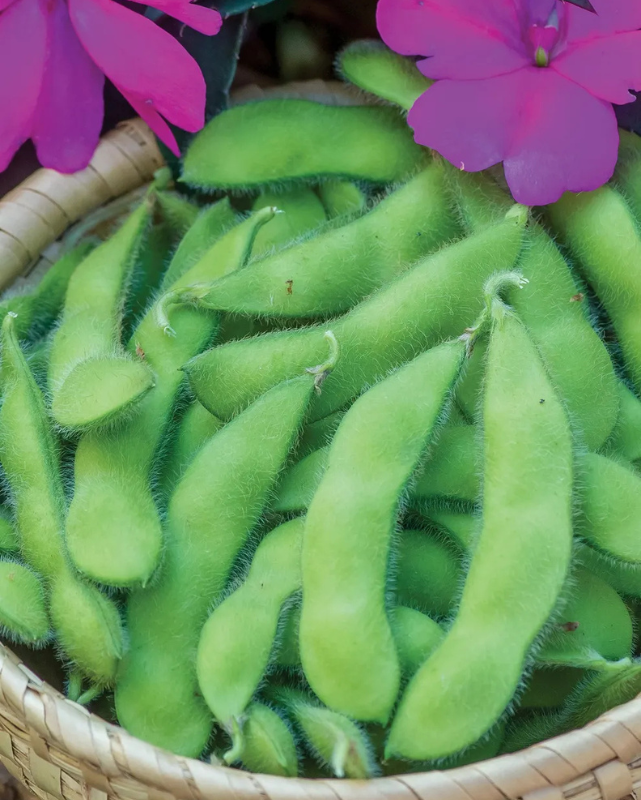 Description: Edamame is nature’s perfect supplement; it is high in protein, vitamins, minerals and fiber. This soybean is grown the same as a bush bean but the pods are harvested all at the same time. When the beans are almost touching one another inside the pod, and the raw beans taste mild and sweet, the edamame is ready to harvest. The easiest way to harvest them is to pull the entire plant then pick off the pods.
