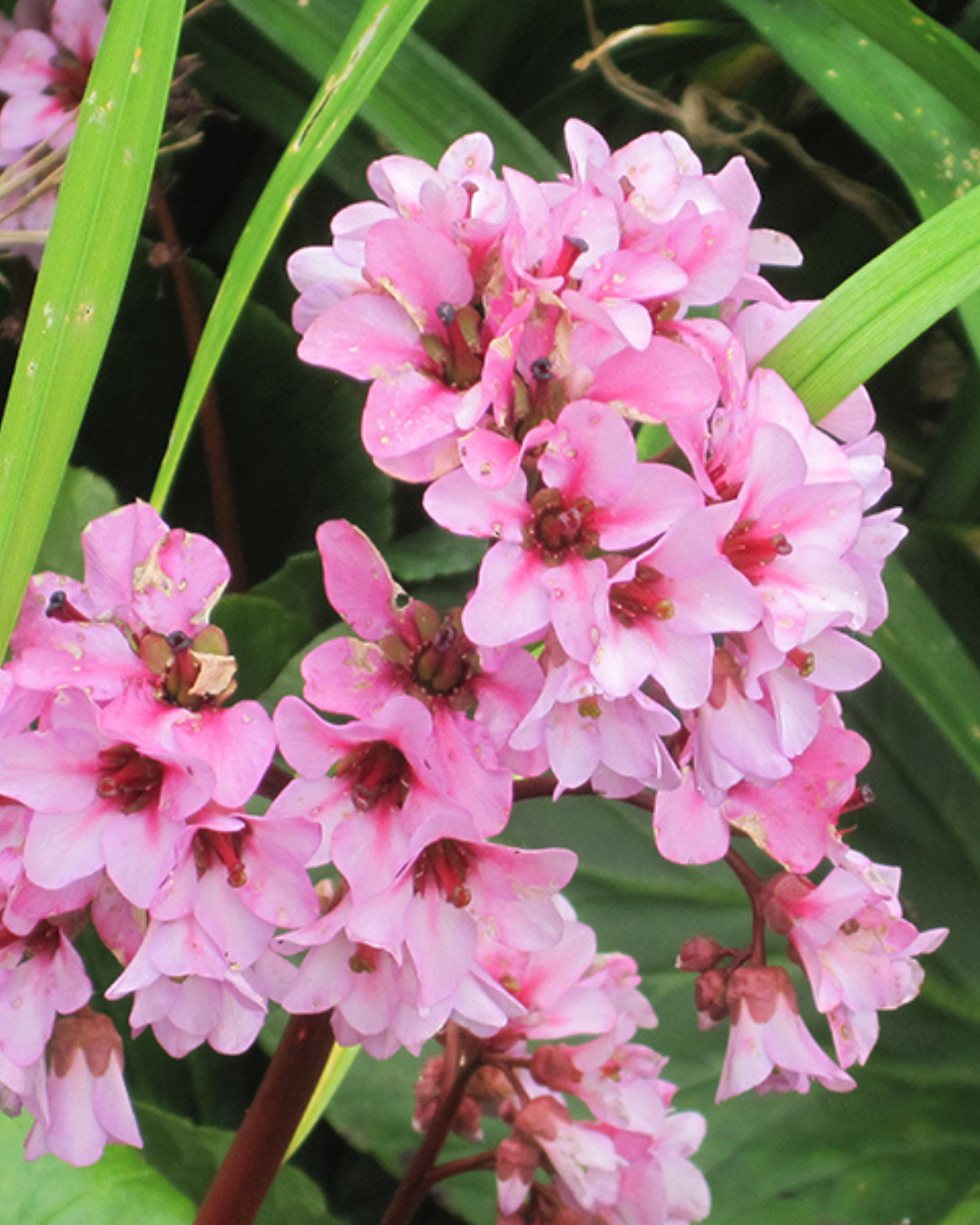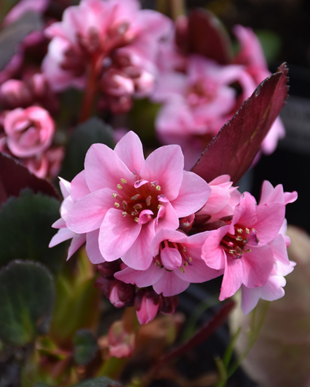 Dragonfly™ Sakura Bergenia has masses of beautiful spikes of semi-double pink bell-shaped flowers rising above the foliage from early to mid spring, which emerge from distinctive rose flower buds, and which are most effective when planted in groupings. The flowers are excellent for cutting. Its attractive large succulent round leaves are dark green in color with curious red undersides. As an added bonus, the foliage turns gorgeous shades of burgundy and in the fall. The dark red stems can be quite attractive.