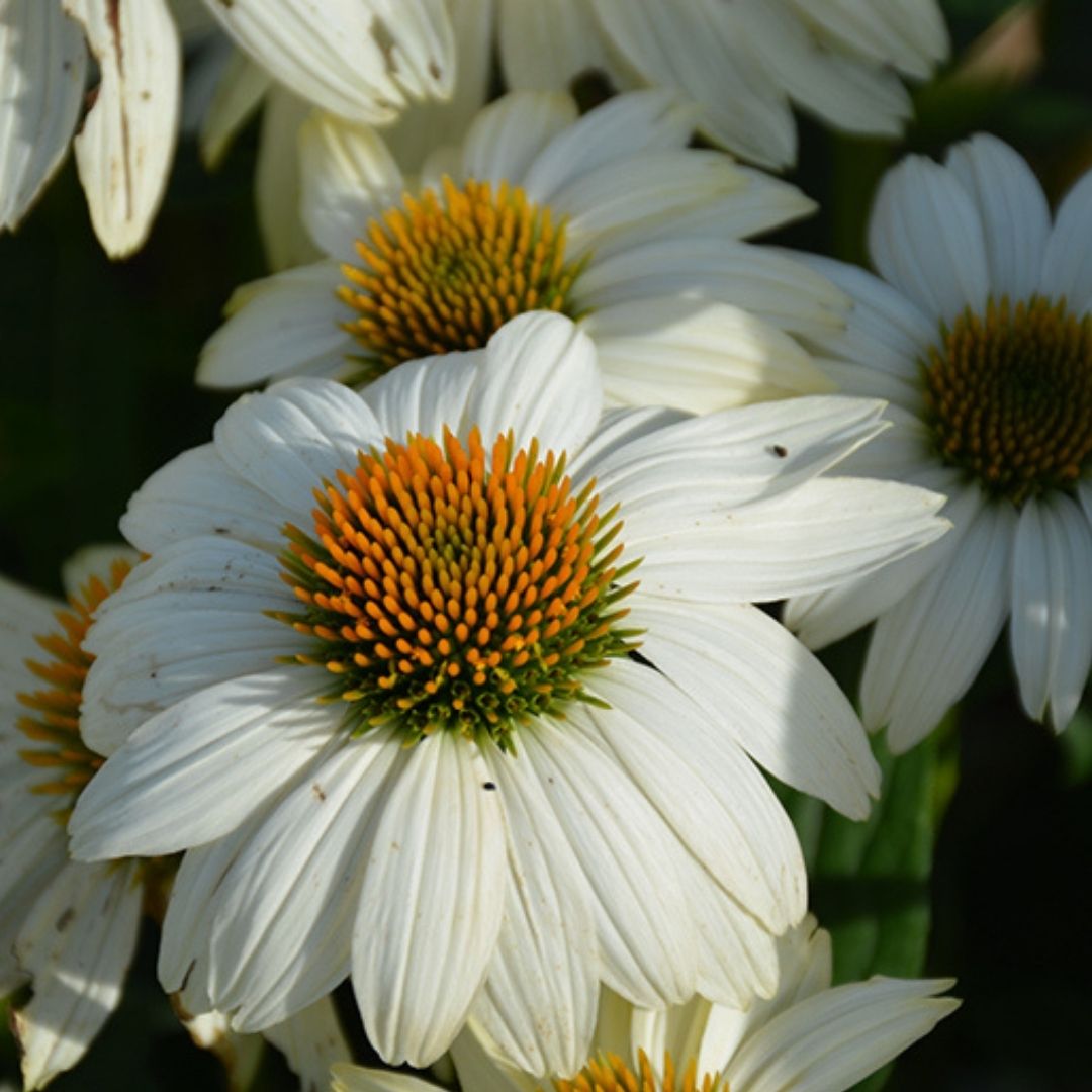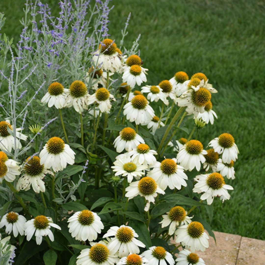 This attractive echinacea produces large pure white flowers with coppery centers; a perfect choice for planting in groups, along border edges, or in containers; great for flower arrangements, attracts pollinators.