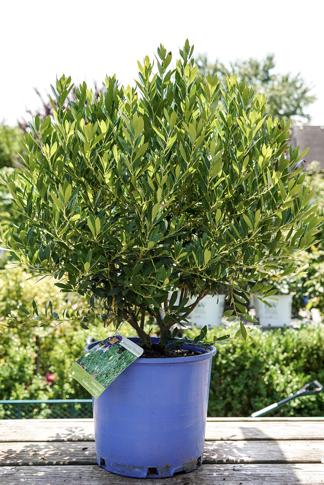 Shamrock Inkberry Holly has dark green evergreen foliage which emerges light green in spring on a plant with an oval habit of growth. The glossy narrow leaves remain dark green throughout the winter.