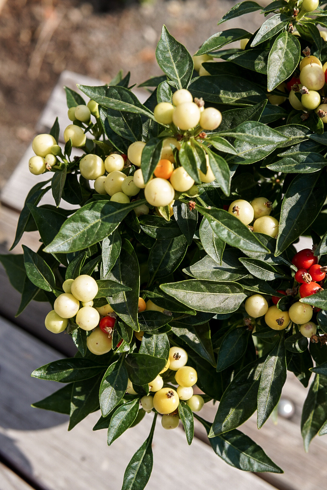 An attractive ornamental pepper with both colorful fruit and handsome foliage; leaves are glossy deep green; small round fruits show yellow, orange and red simultaneously ; a wonderful garden accent plant for hot locations.
