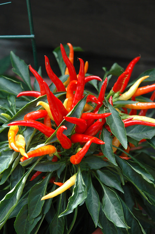 This variety produces dense upright clusters of very showy, long twisting fruit that emerge cream, then progress to yellow, orange, and finally to red when they mature; a stunning color display for hot, sunny locations.